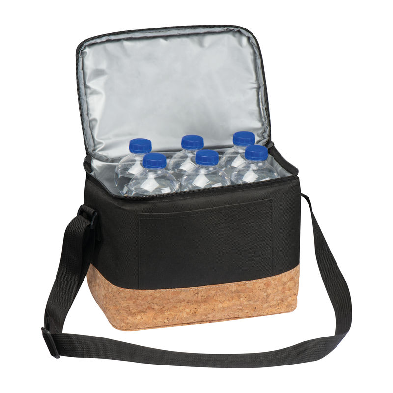 Cooler bag from 600D polyester with cork bottom, big space for up to 6 bottles or cans with 0,5 litre. Your logo will be printed onto the front compartment.