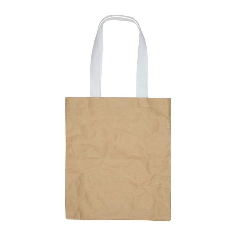 Durable shopping bag featuring long handles, with a laminated interior and an exterior covered in paper – both robust and practical.
