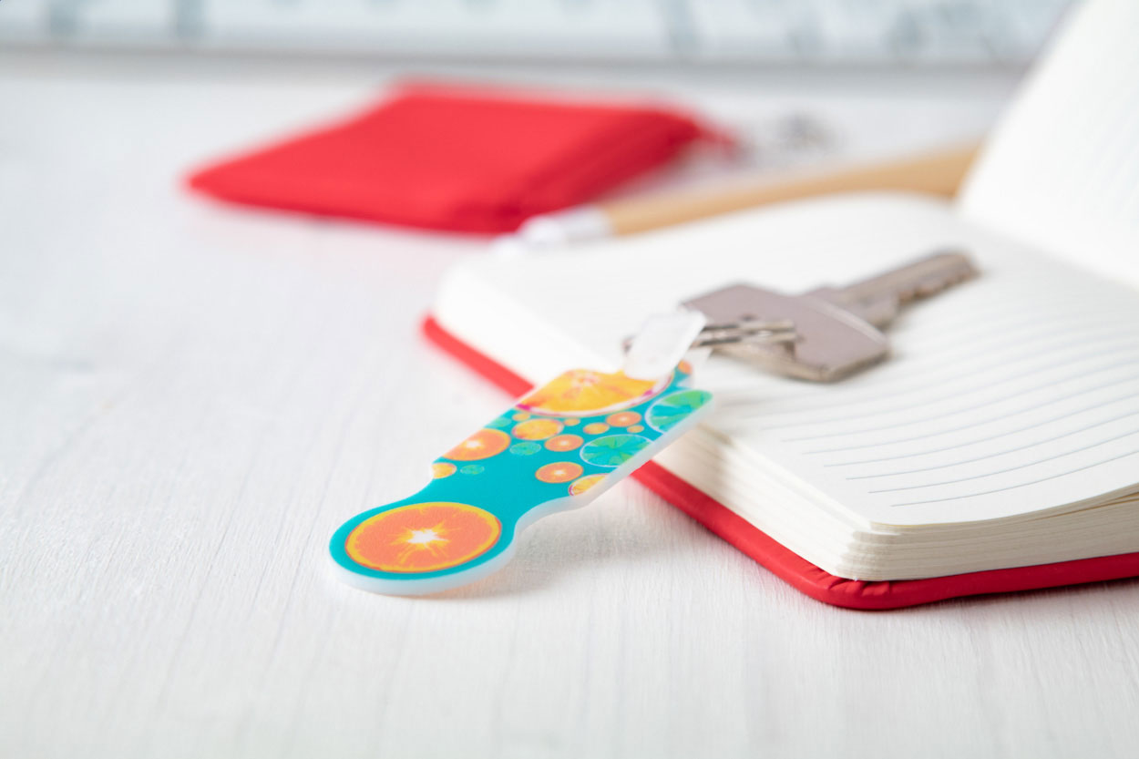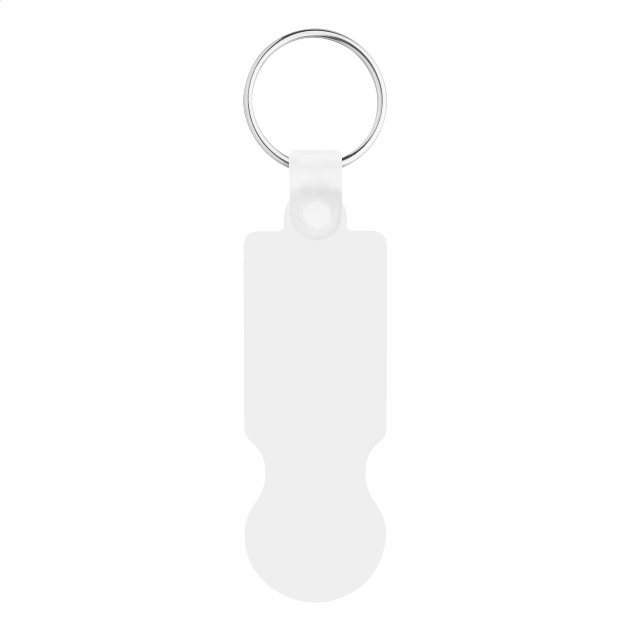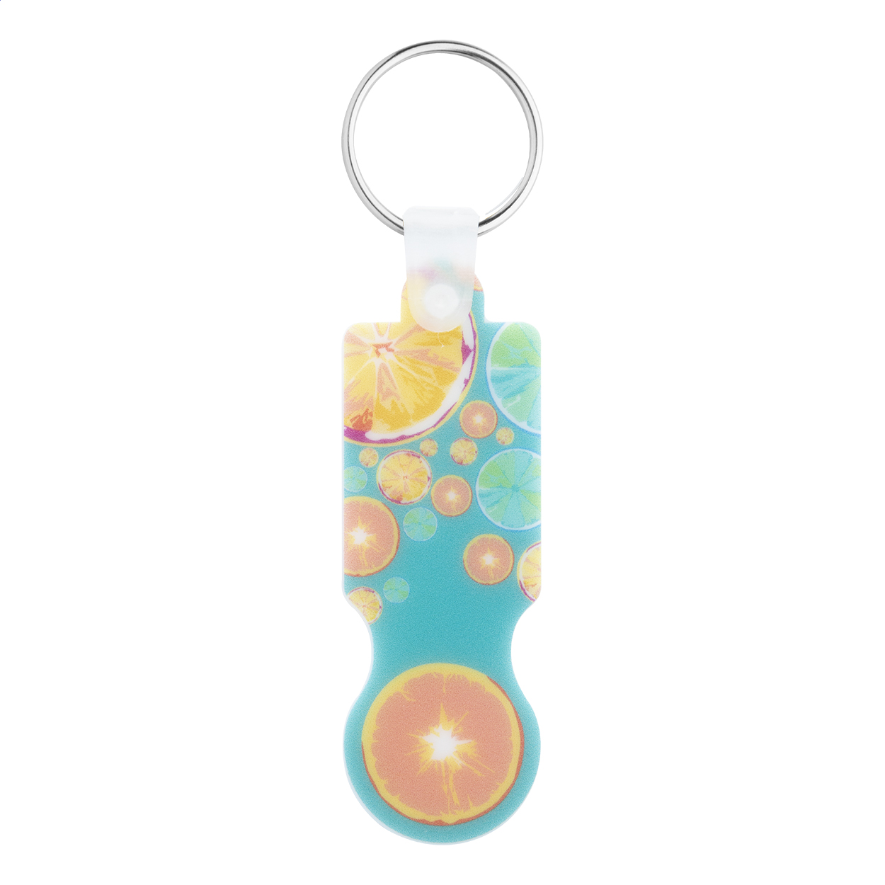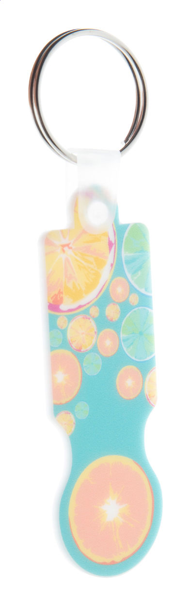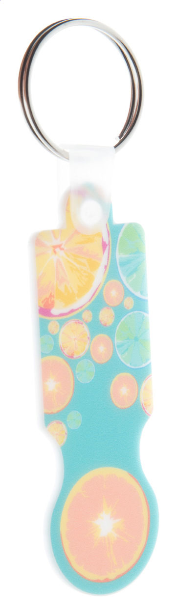 Plastic shopping trolley coin keyring with full colour graphics. Price includes UV LED printing on one side. MOQ: 200 pcs.