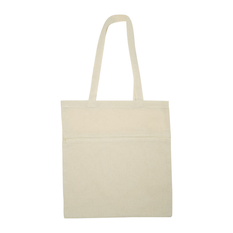 Oeko-Tex® STANDARD 100 certified, natural coloured cotton bag (140g/m²) with two carrying straps and a closable front pocket. Your logo will be printed on the front pocket.