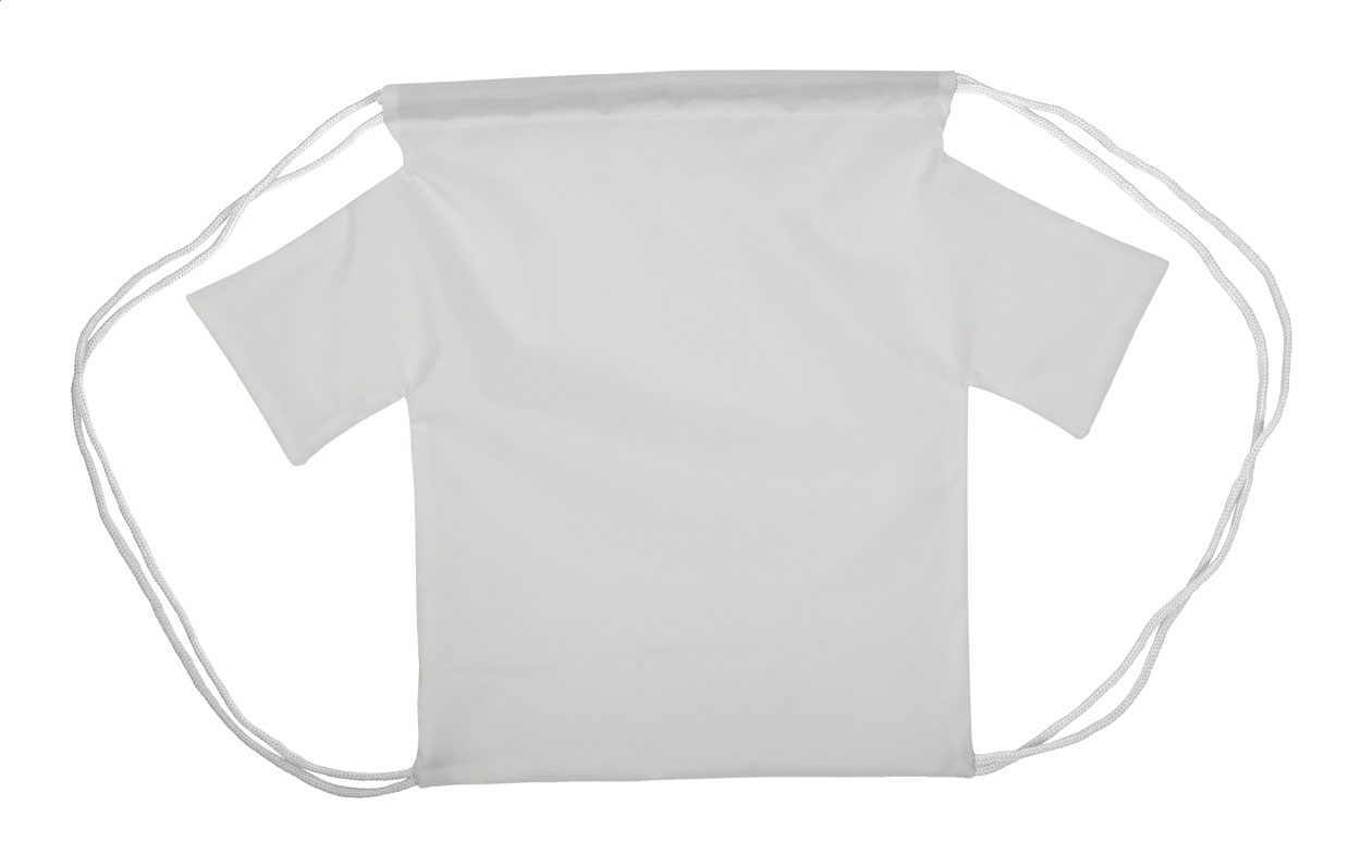 Custom made, T-shirt shaped drawstring bag for children with coloured strings, 190T polyester. With all over sublimation printed graphics. MOQ: 25 pcs.