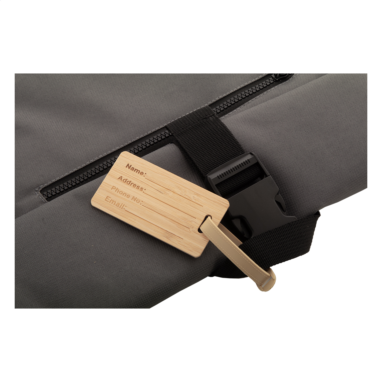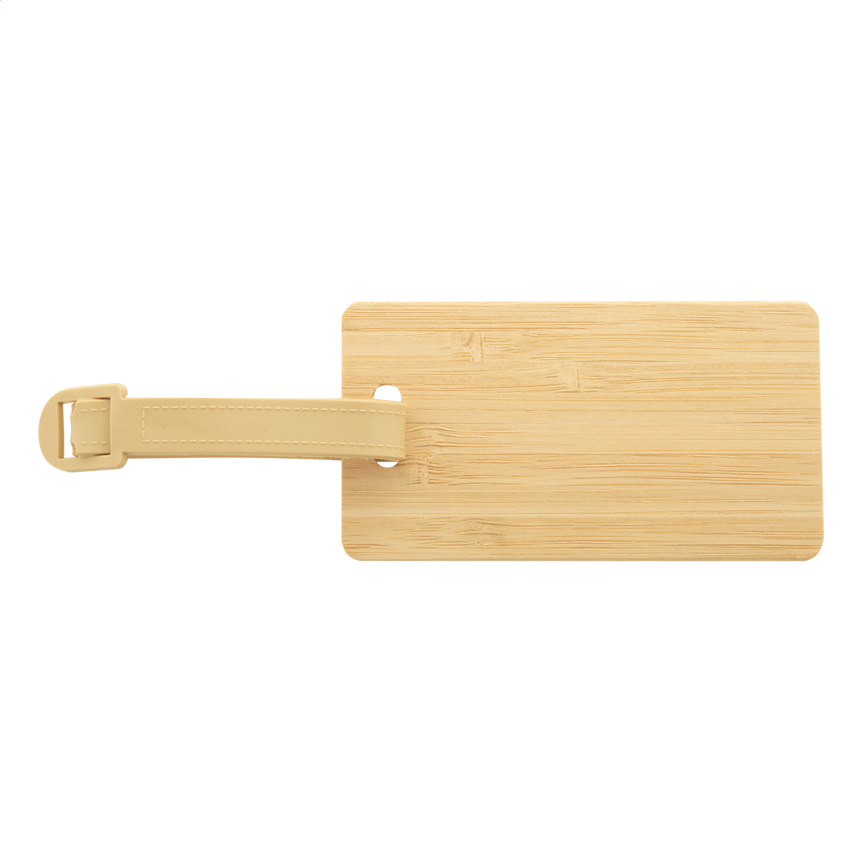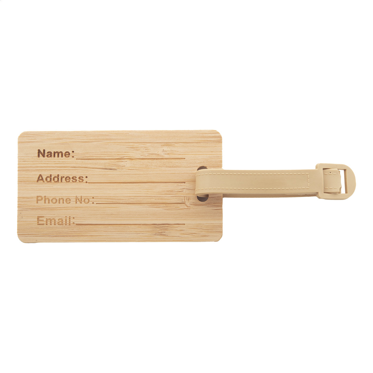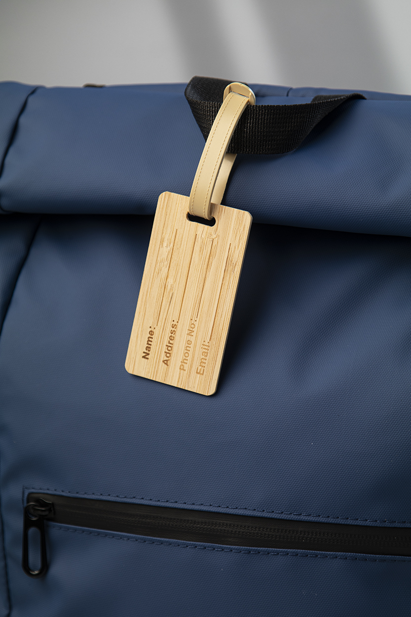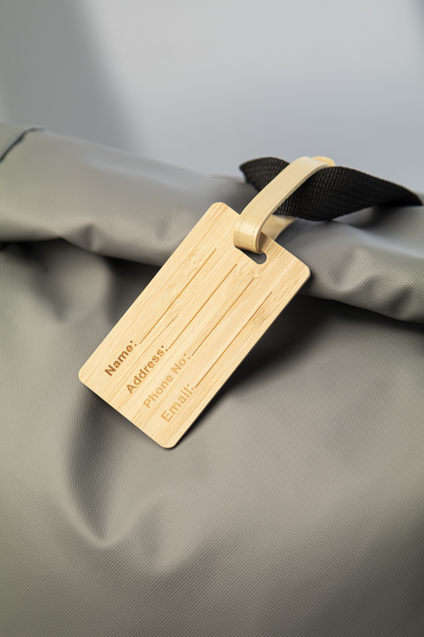 Bamboo luggage tag with plastic strap and buckle.