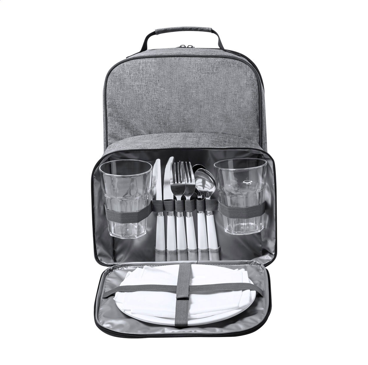 RPET picnic cooler backpack with padded straps and back, cooler compartment with PEVA padding. Includes 2 glasses, 2 knives, 2 spoons, 2 forks, 2 plates and 2 napkins. 600D RPET polyester with distinctive RPET label.