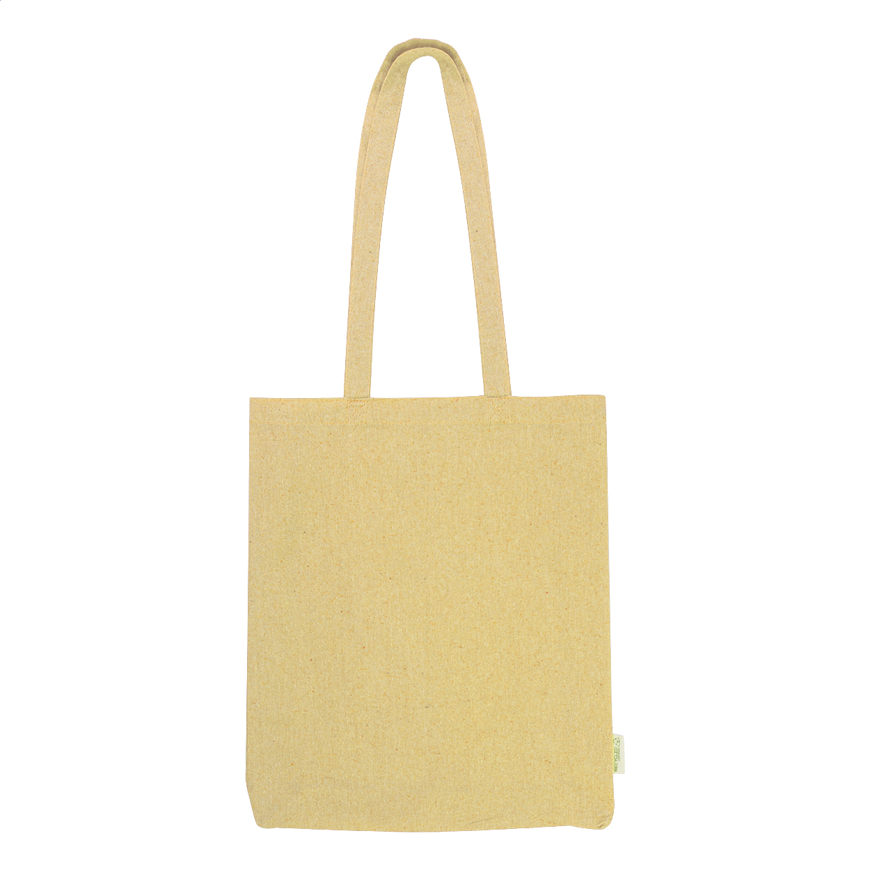 Reusable, recycled cotton shopping bag with long handles and distinctive recycled cotton label. 100% recycled cotton, 140 g/m².