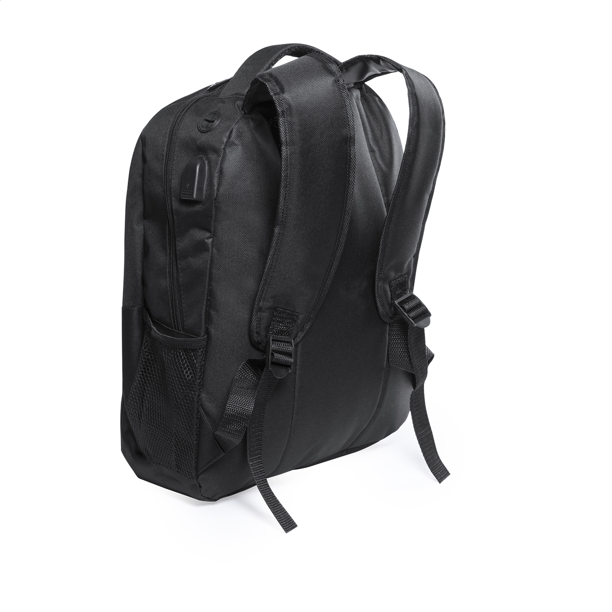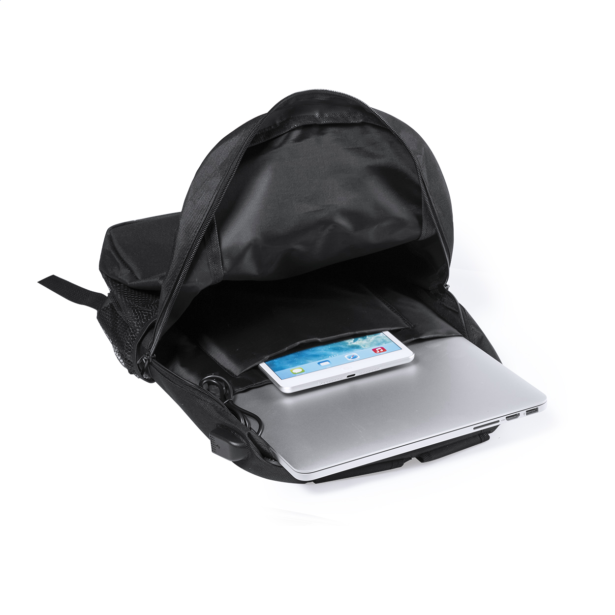 Waterproof backpack with zipped compartments, padded laptop (15") and tablet (10") compartment, padded back and shoulder strap. With earphone outlet and built-in USB connection for power banks. 600D polyester.