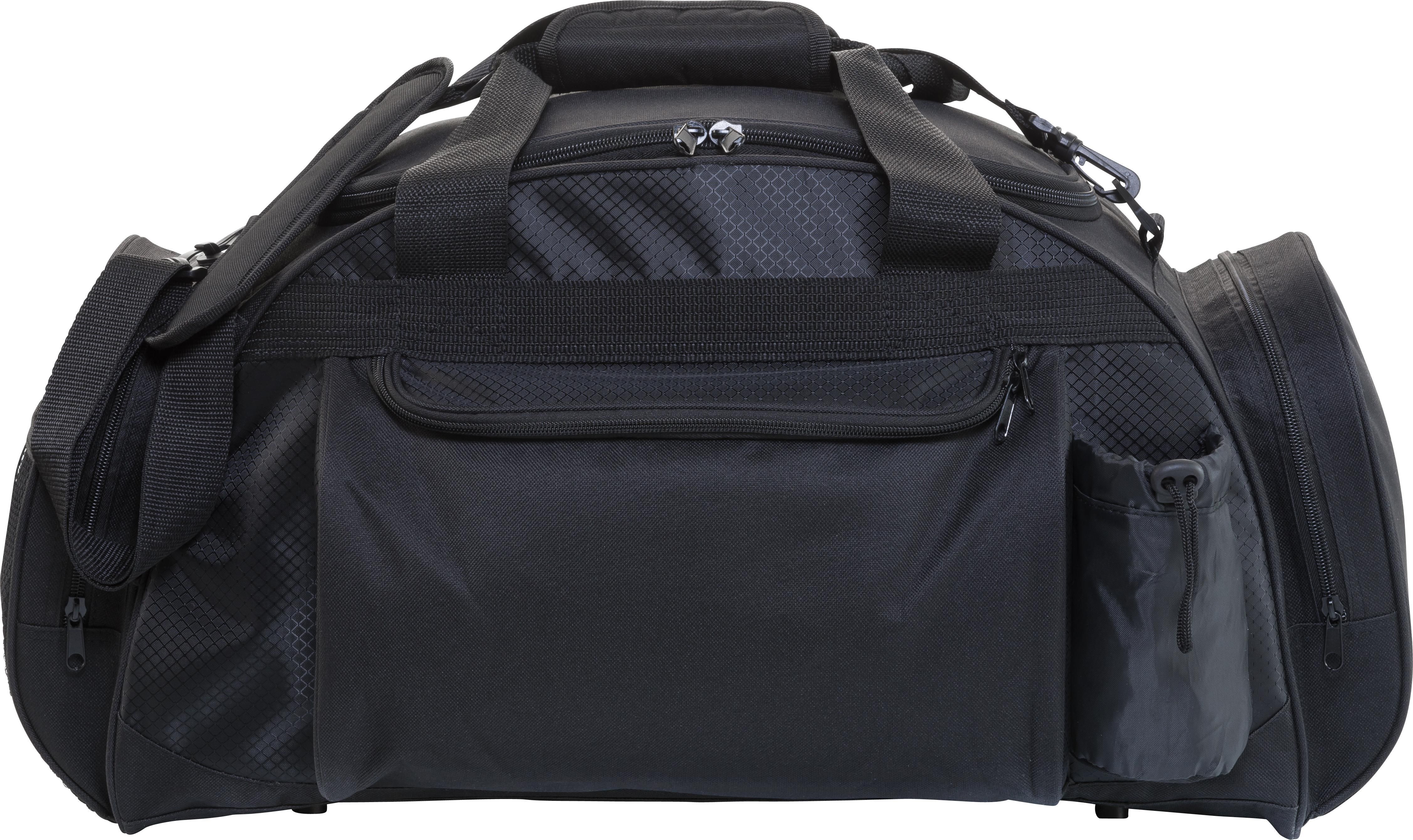 Polyester (600D) sports bag with a front zippered pocket, a side pocket for a bottle, a side pocket for a headset, and one large zipped compartment (bottle not included).