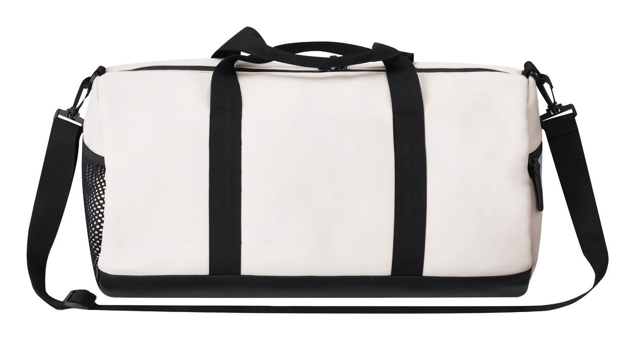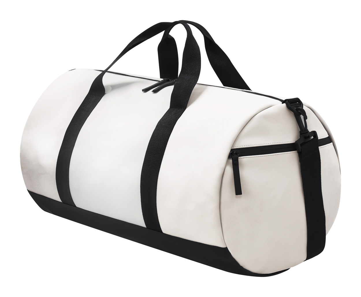 Soft PU leather sports bag with zipped compartment and pockets, mesh side pocket and adjustable shoulder strap.
