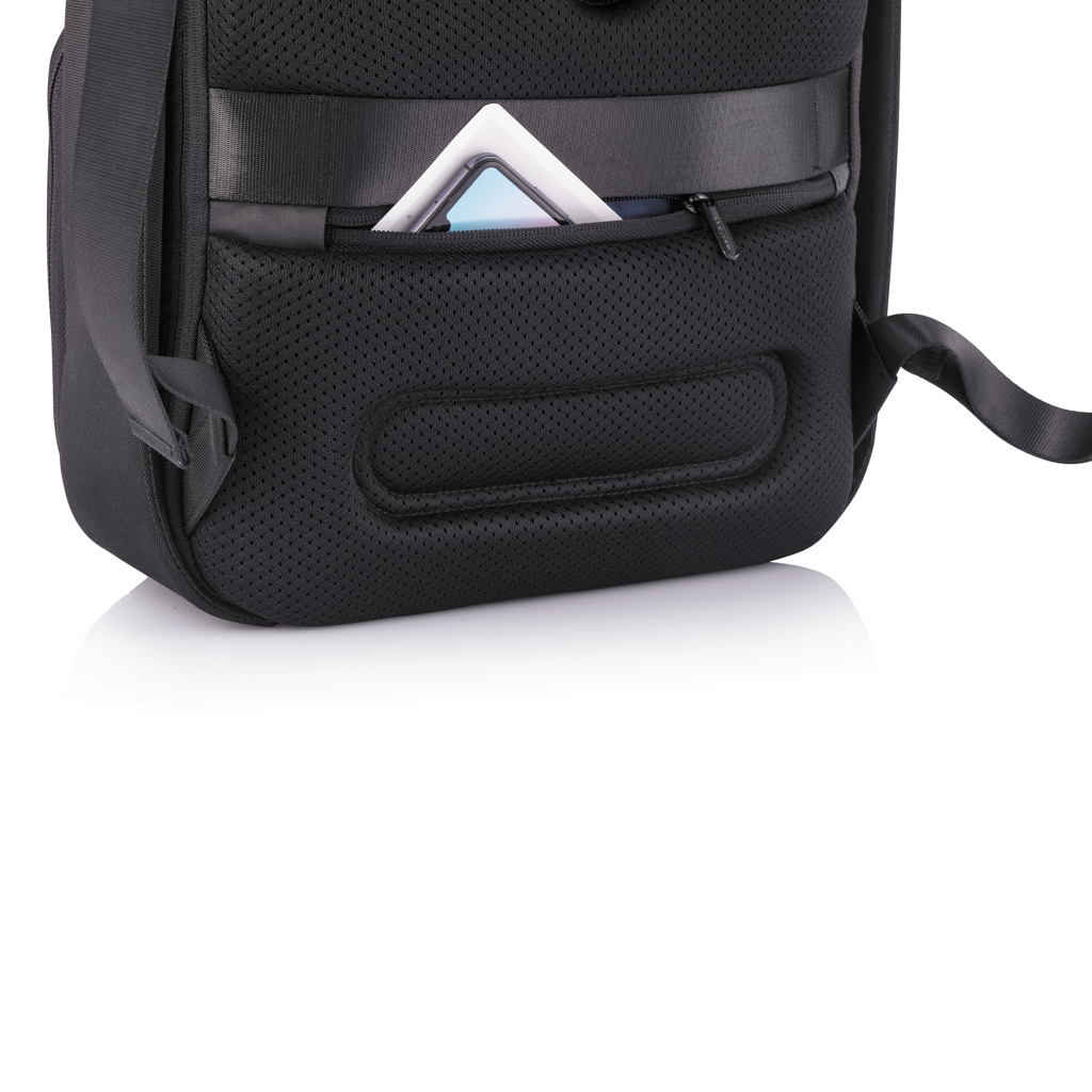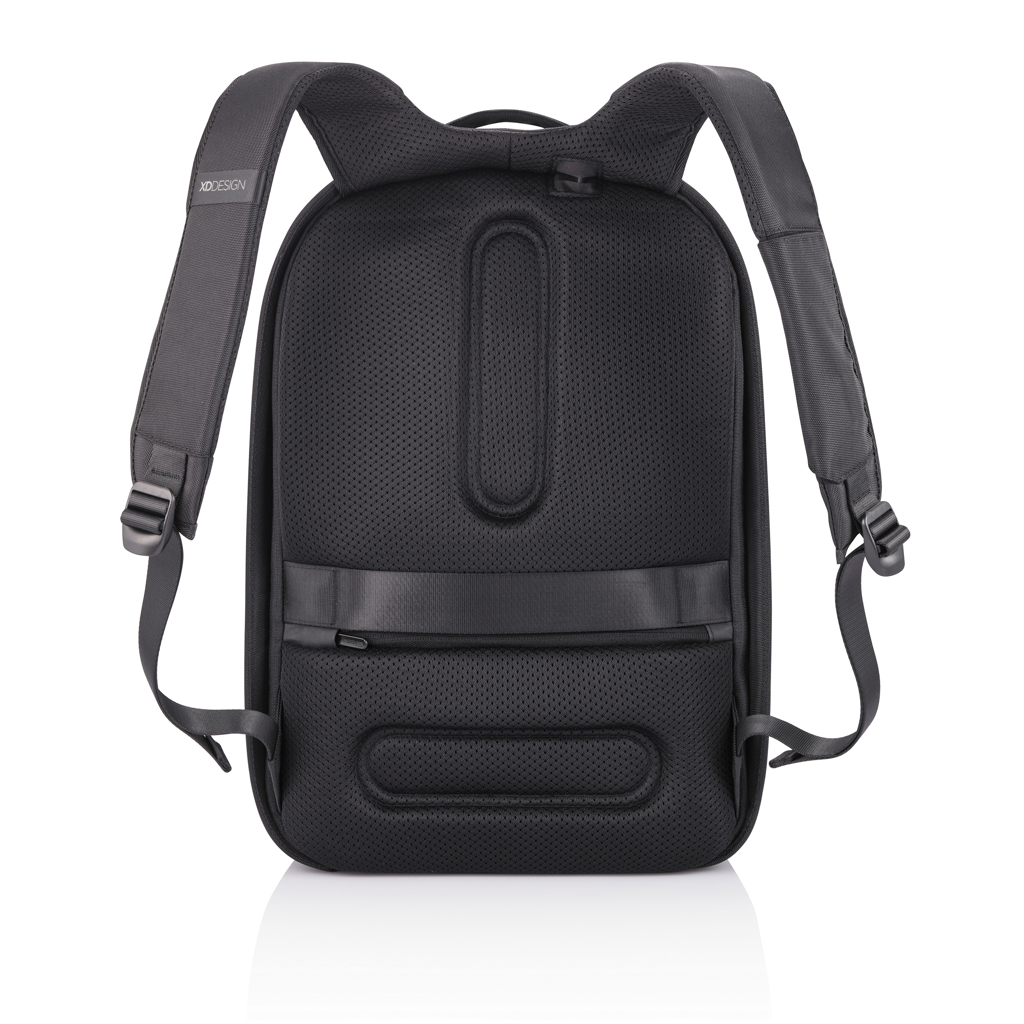 Flexible and practical, the XD Design Flex Gym bag is the first business backpack and gym bag all in one. Quickly convert this backpack from business to gym style, just expanding the front pocket, from 16 to 24 Litres.The anti-theft design with no front access and hidden zippers in the main compartment will ensure that you carry your professional devices securely. With the RFID protected pocket on the back you can safely store your wallet, cell phone or credit cards. Additionally, this backpack keeps you powered with a fast USB charging port on the shoulder strap where you can also find a sunglasses holder. Made from RPET materials - using recycled water bottles that would end up in landfill or oceans and saving litres of water during the production process. The perfect backpack whether you are on your way to work, university or the gym. Registered design®.