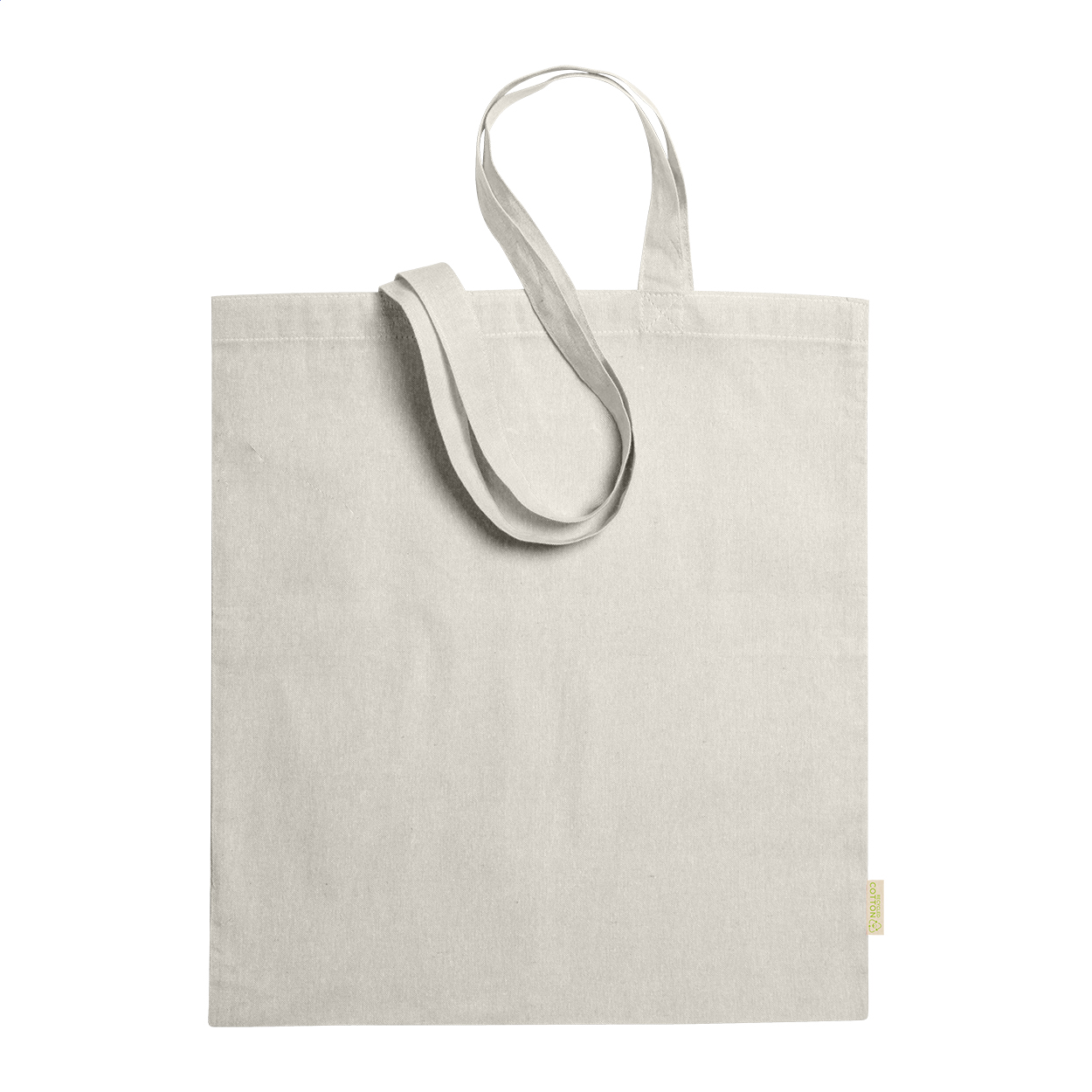 Reusable, recycled cotton shopping bag with long handles. 100% recycled cotton, 120 g/m².