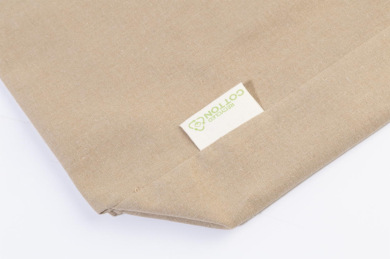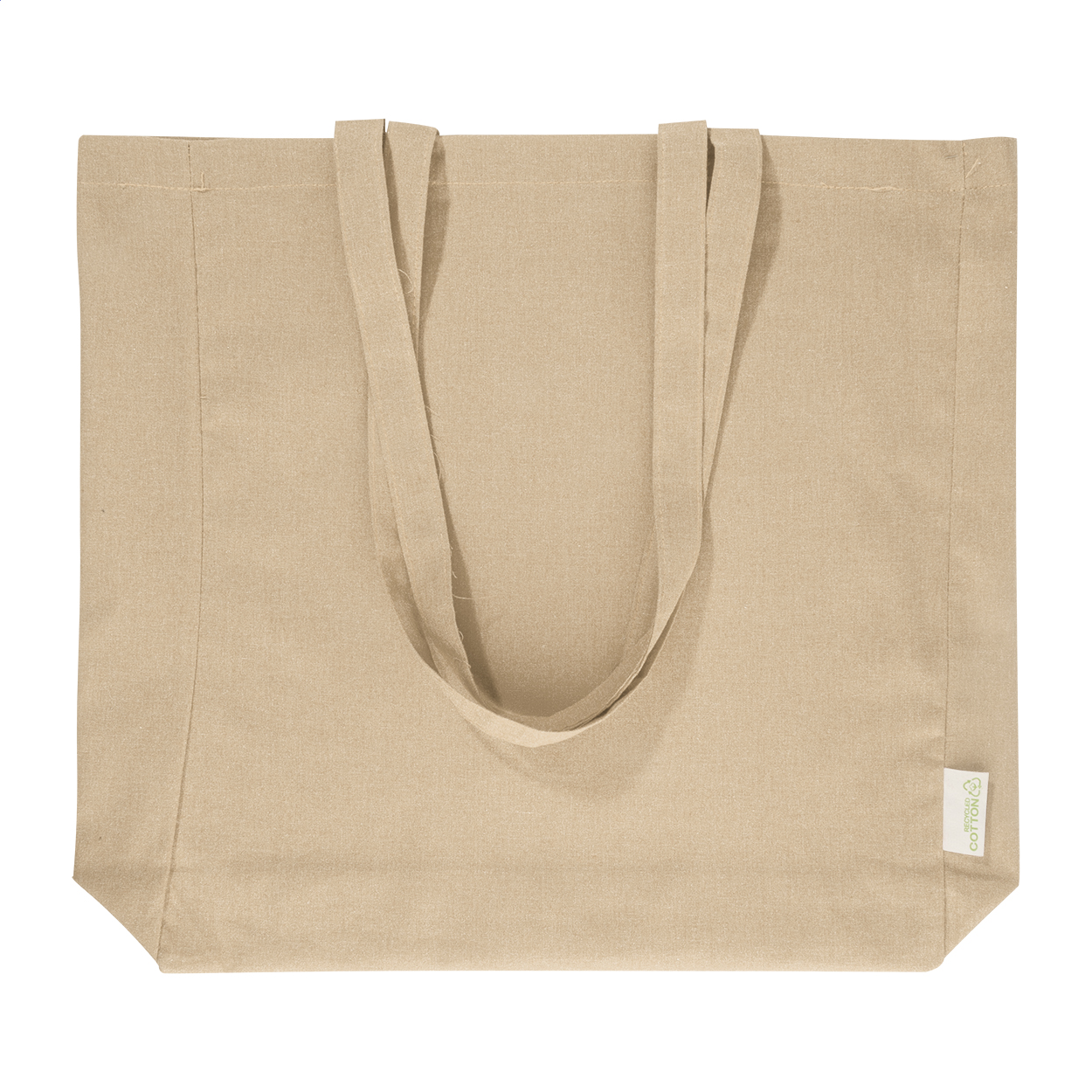 Shopping bag with gusset and long handles in 70% recycled cotton and 30% RPET polyester, 140 g/m². With distinctive recycled cotton label.