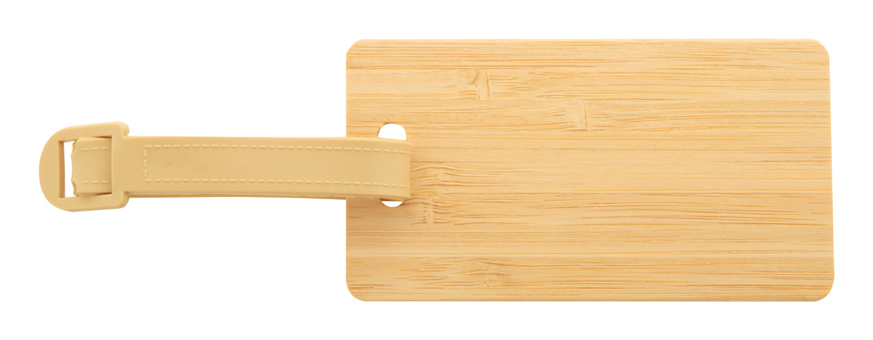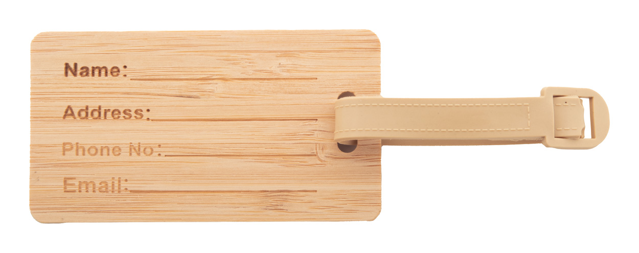 Bamboo luggage tag with plastic strap and buckle.