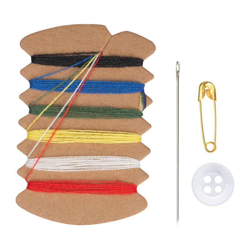 Travel sewing kit in an cardboard packaging with all the necessary utensils for a quick repair. Your logo will be printed on the paper bag.