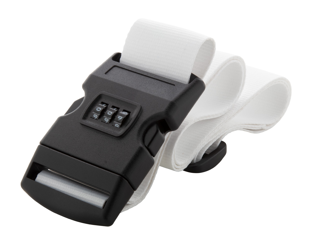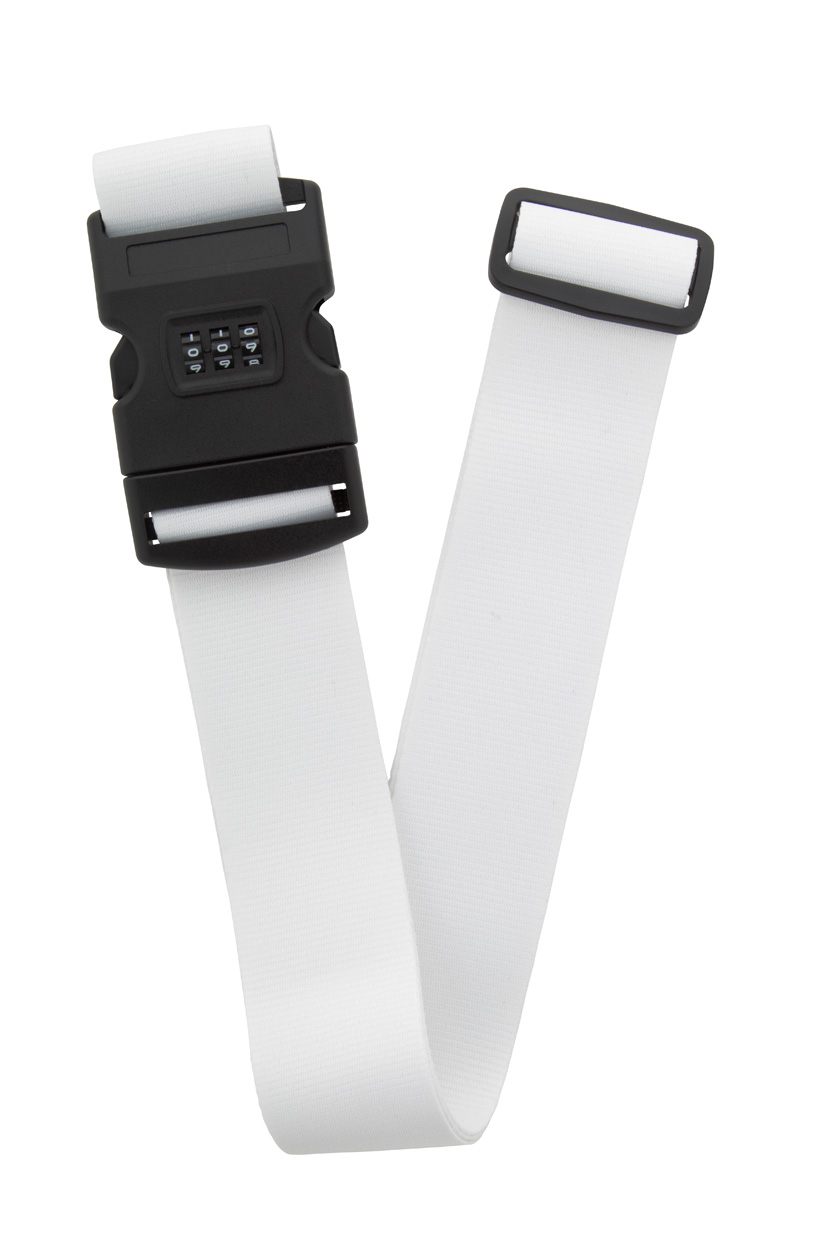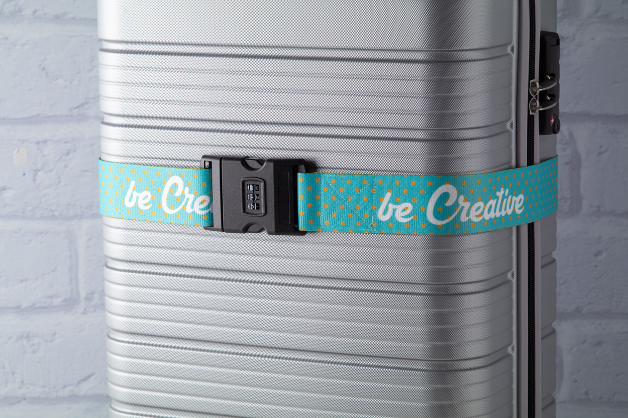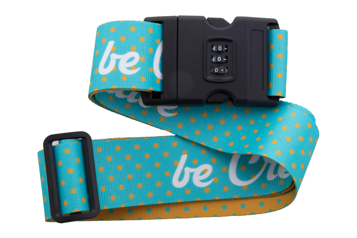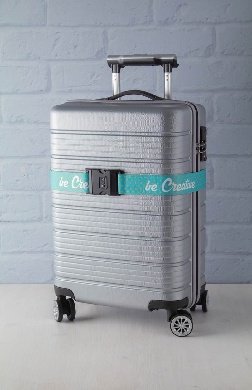 Custom made, polyester luggage belt with adjustable strap and 3-digit combination lock. With sublimation printed graphics on both sides. MOQ: 50 pcs.