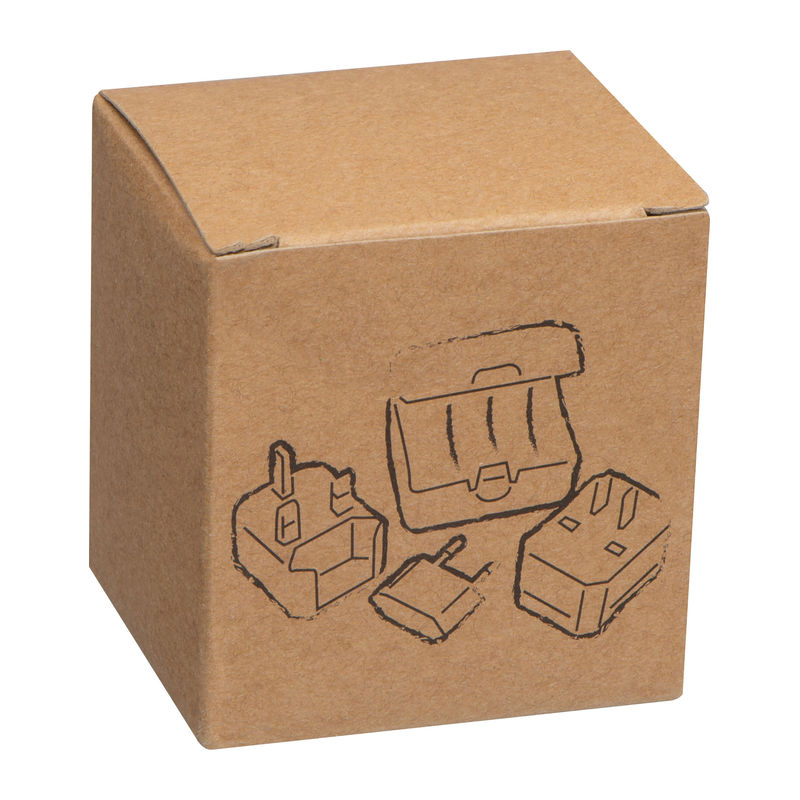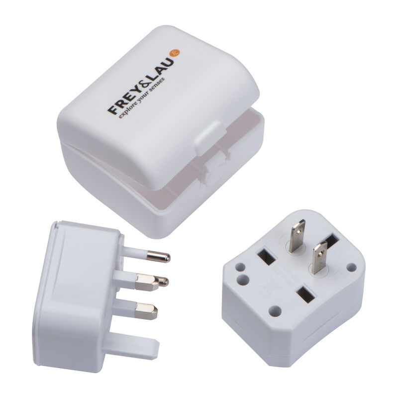 Wherever you travel to, from now on you will always have the needed adapter with you (US, UK, AUS, EU, Asia). Your logo will be printed on the box.