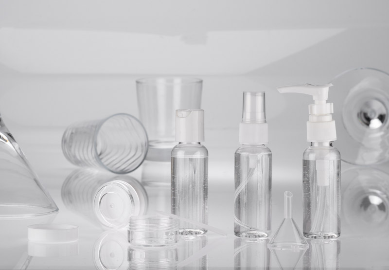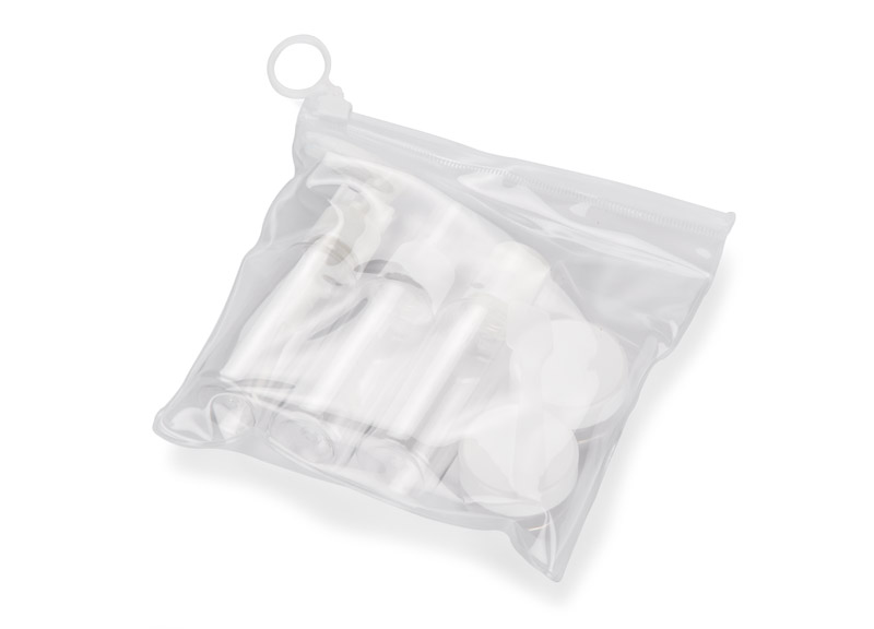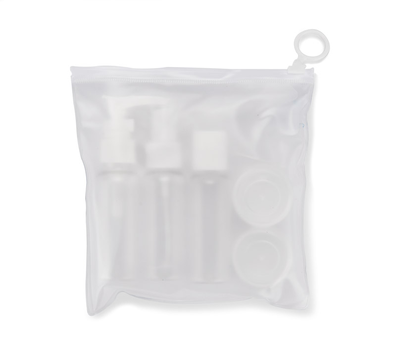 The practical AIRO travel bottle set allows for convenient and hygienic storage of cosmetics during travel. It consists of: a bottle with atomiser, a bottle with pump, a bottle with closure and two jars. The included funnel makes it easy to pour liquids with precision, and the spoon is ideal for layering creamy cosmetics. The transparent containers with white caps make it easy to identify the contents. The set also includes a case, transparent on one side and milky on the other, with a zipper closure. The compact size of the containers meets airline requirements.