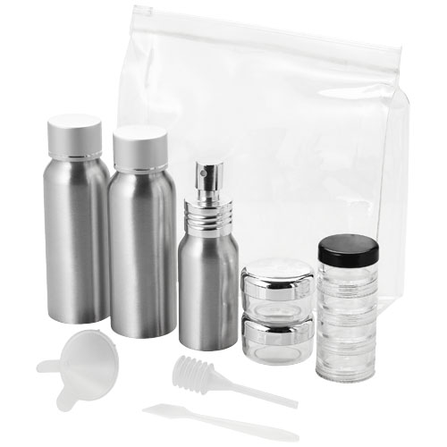 Contains 2 x 80 ml aluminium bottles, 1 x 40 ml aluminium spray bottle, 2 x 2 ml jars, 1 x 4 layer jar, a funnel, a spatula and a sucker. Bottles, funnel etc packed in polybag, comes separately from pouch. Decoration not available on components.