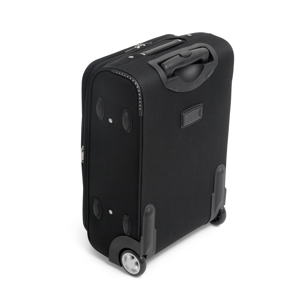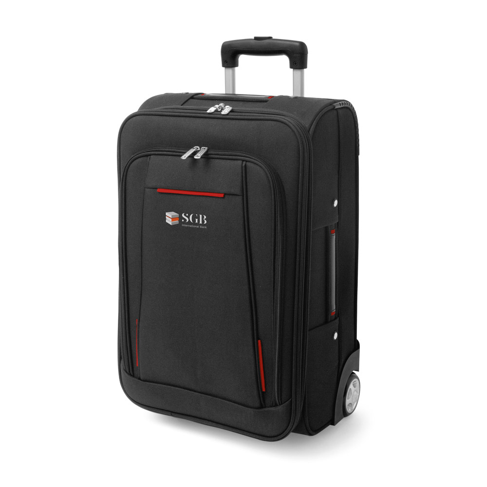 Travel Trolley in 600D and EVA with semi-rigid front compartment and lined interior. Identification tag on the back. Extendable aluminium handle with spring. The trolley has a capacity up to 28 L and weighs 2'95 kg. 345 x 520 x 195 mm