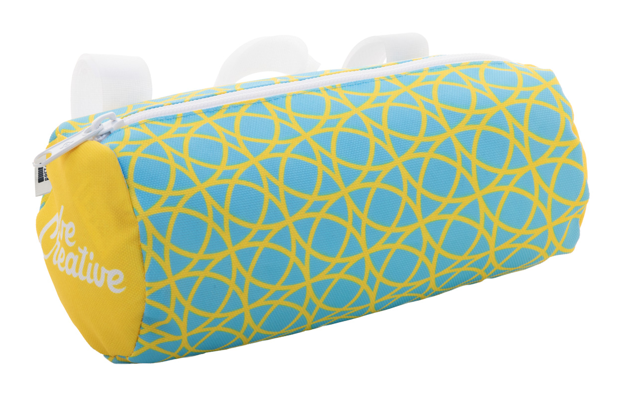 Custom made, zipped bicycle handlebar bag in 600D RPET polyester with adjustable velcro straps. With all-over sublimation printed graphics and distinctive RPET label. MOQ: 25 pcs.