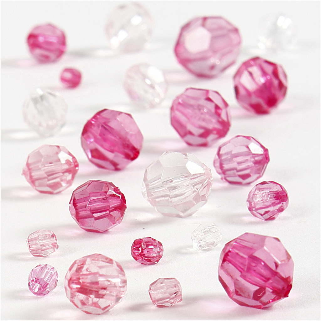 Exclusive crystal mix of 'A' grade transparent faceted acrylic beads in 5 different sizes. Faceted Bead Mix, pink, size 4-12 mm, hole size 1-2,5 mm, 45 g/ 1 pack