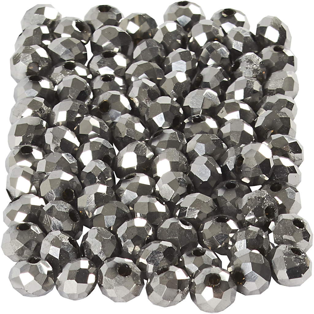Crystal glass beads in a flat round shape, in bright colours. Threaded onto a strand. Threaded onto a strand. Faceted Beads, metallic grey, size 3x4 mm, hole size 0,8 mm, 100 pc/ 1 pack