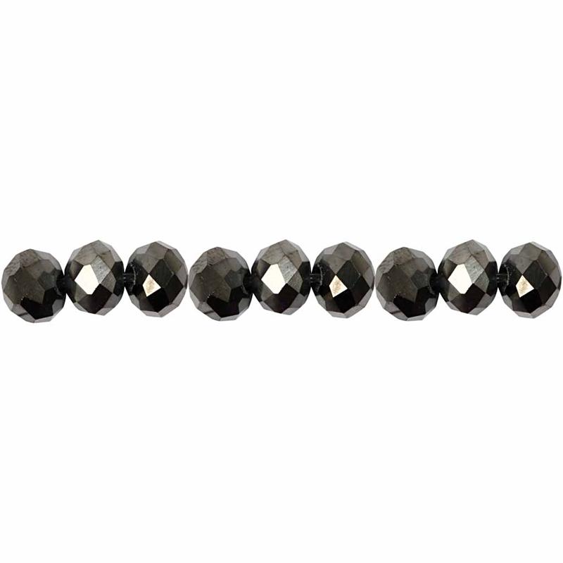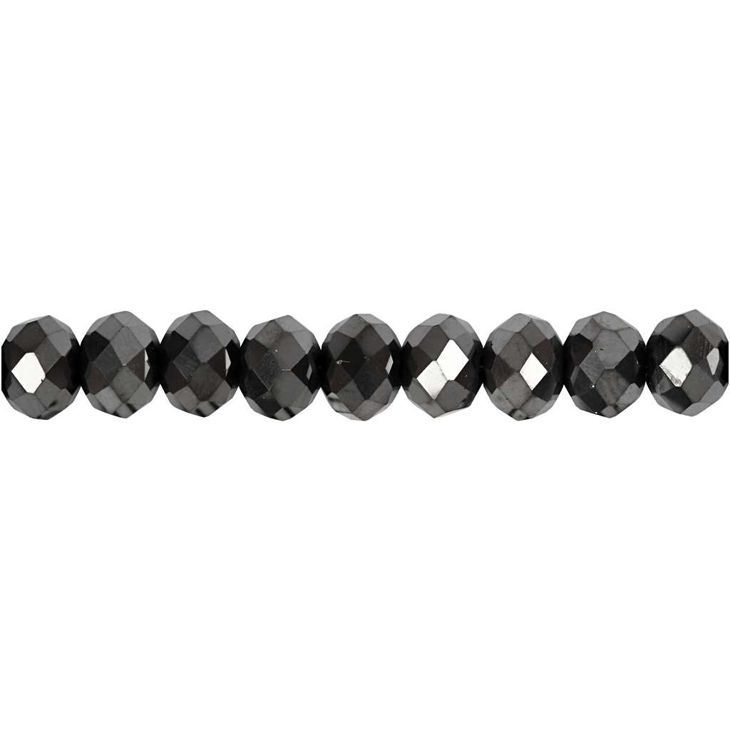 Crystal glass beads in a flat round shape, in bright colours. Threaded onto a strand. Threaded onto a strand. Faceted Beads, metallic black, size 5x6 mm, hole size 1 mm, 100 pc/ 1 pack