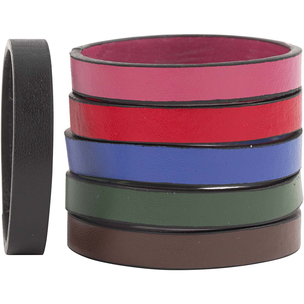 Broad, faux leather belt with Colourued surface and black edges. Pack with 6 different colours each of 1 m. Faux Leather Belt, assorted colours, W: 10 mm, thickness 3 mm, 6x1 m/ 1 pack