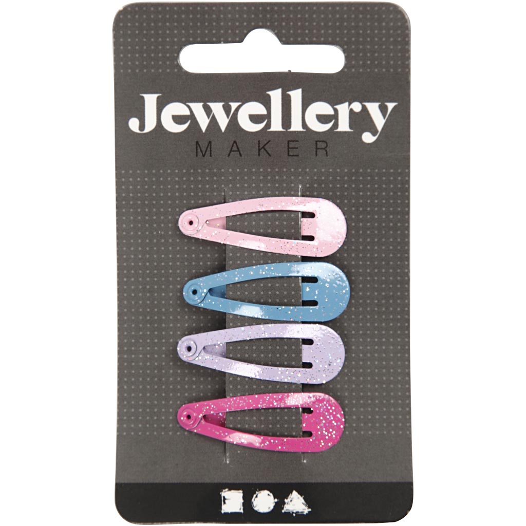 Small metal buckle in pastel colors with glitter and hole at the outer end for fastening ornaments with beads and the like. Hair Slide, blue, pink, purple, light red, L: 32 mm, W: 12 mm, 4 pc/ 1 pack