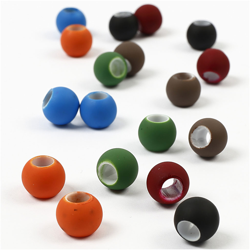 An assortment of round acrylic beads with big hole and matte, coloured surface. Pack with 6 colours. Link Beads, assorted colours, size 8x10 mm, hole size 5 mm, 300 g/ 1 pack