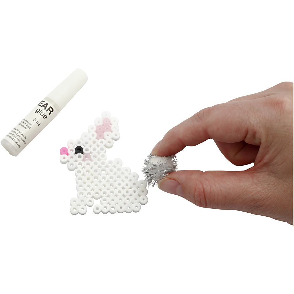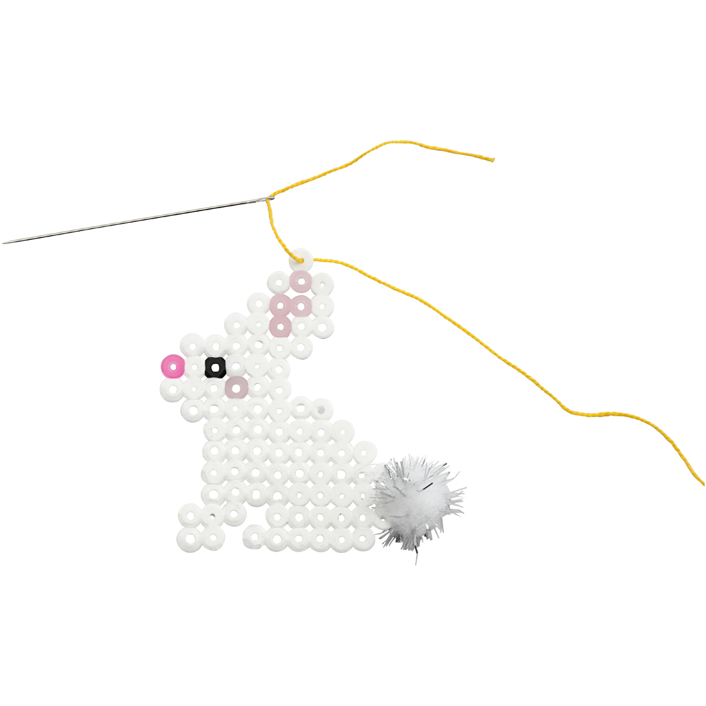 Material set for Easter suspension of fuse beads. Inspiration and pattern sheets included. Content: fuse beads in 5 different colours, square bead plate, glitter pompoms, suspension cord, suspension eye and glue. Mini Craft Kit, Suspension, 1 pack