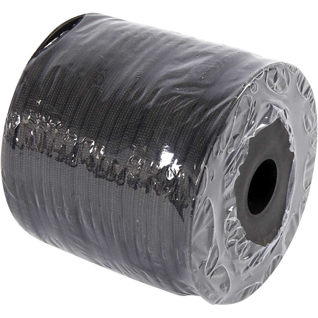 Good quality, flat, semi-gloss nylon cord with white core. Polyester Cord, black, W: 5 mm, 50 m/ 1 roll