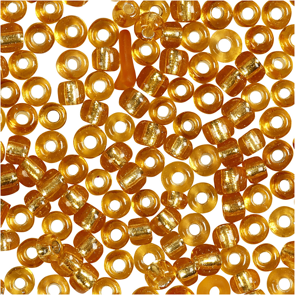Small, coloured glass beads that are great for homemade jewellery. Use them for necklaces, bracelets, earrings and more. Rocaille seed beads, gold, size 8/0 , dia. 3 mm, hole size 0,6-1,0 mm, 25 g/ 1 pack