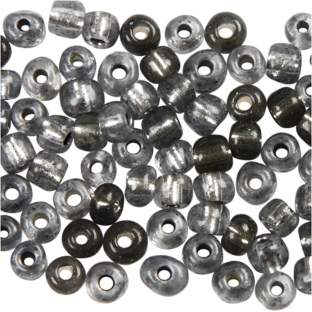 Small, coloured glass beads that are great for homemade jewellery. Use them for necklaces, bracelets, earrings and more. Rocaille seed beads, clear grey, size 6/0 , dia. 4 mm, hole size 0,9-1,2 mm, 25 g/ 1 pack
