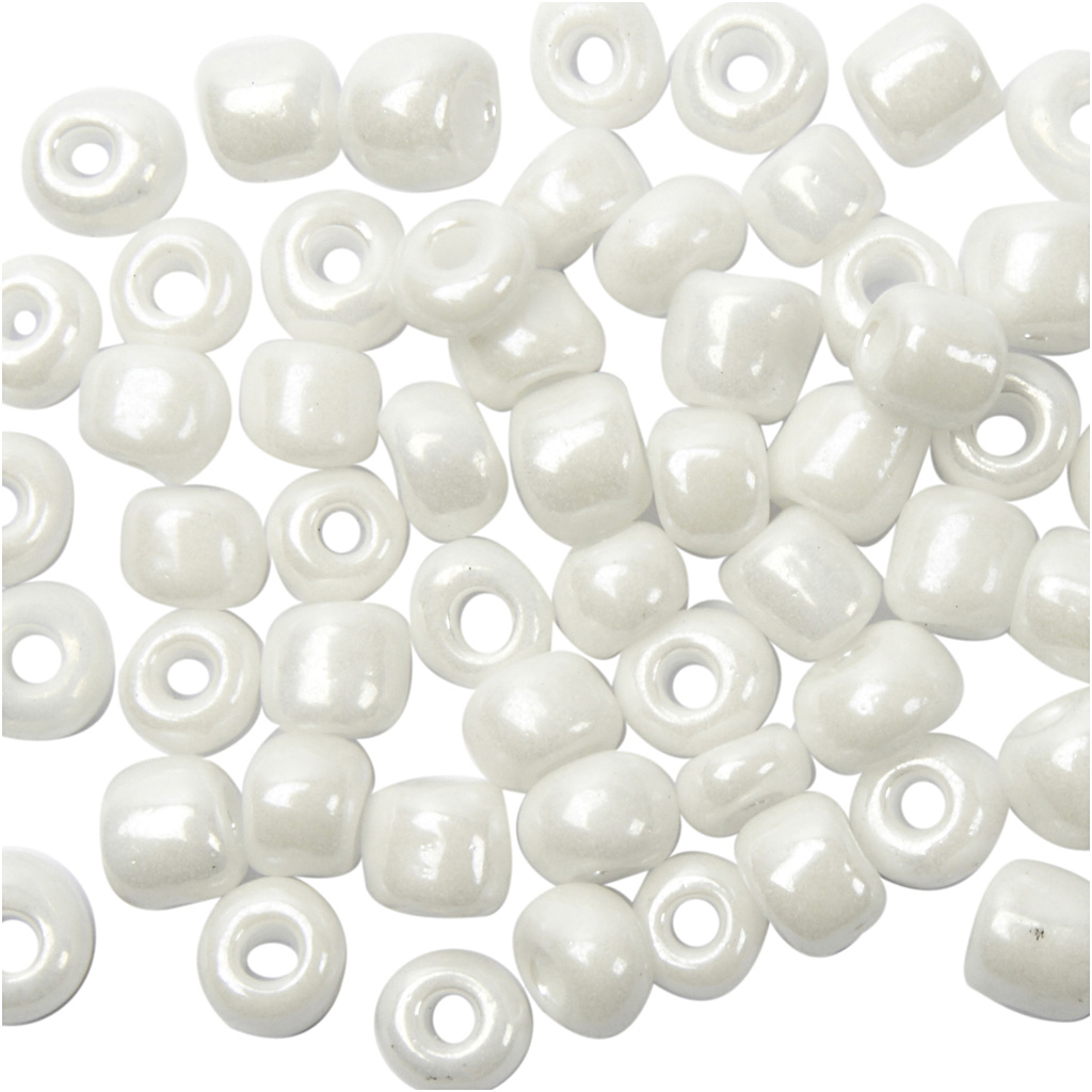 Small, coloured glass beads that are great for homemade jewellery. Use them for necklaces, bracelets, earrings and more. Rocaille seed beads, white - mother-of-pearl, size 6/0 , dia. 4 mm, hole size 0,9-1,2 mm, 25 g/ 1 pack