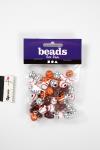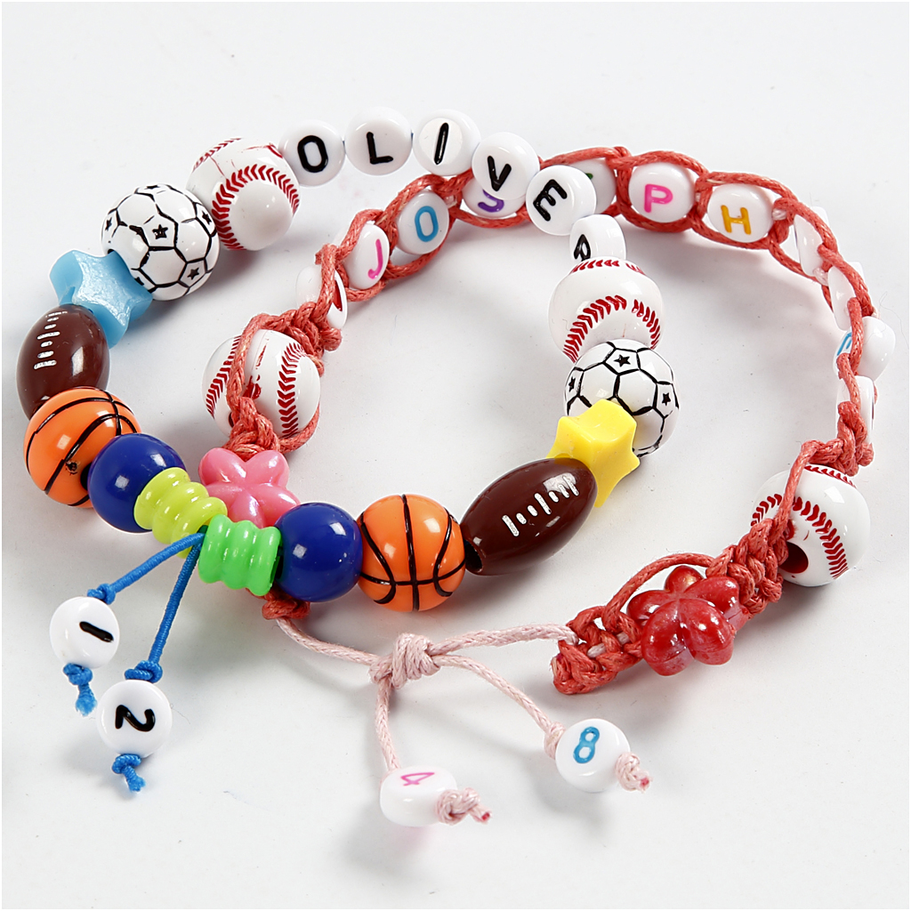 A mix of round beads in the shape of sports balls. Each of the coloured plastic beads is embossed, with characteristic details. Sports Beads, assorted colours, size 11-15 mm, hole size 3-4 mm, 45 g/ 1 pack