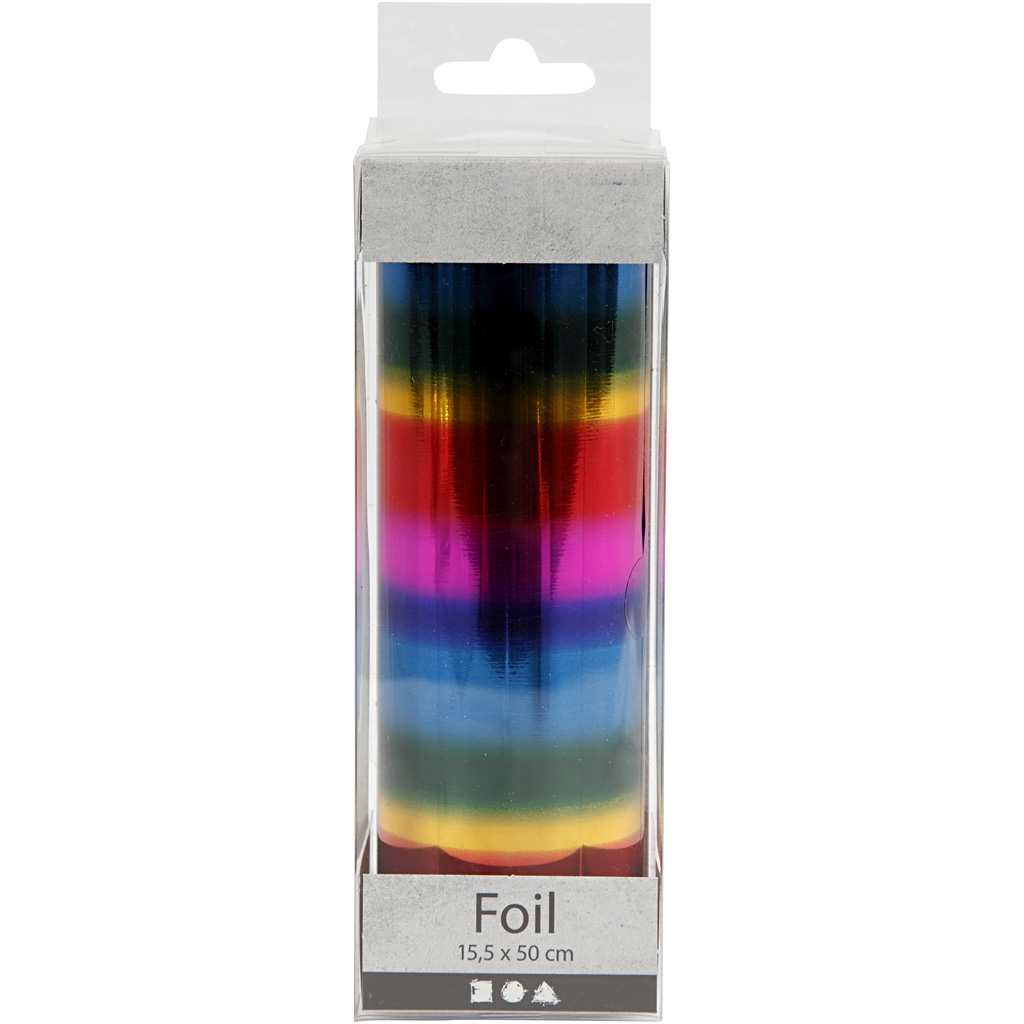 Decorative foil with metallic surface. Transferable to cardboard, paper, wood, etc. with adhesive tape, powertape, fix glue. Deco Foil, rainbow colours, W: 15,5 cm, thickness 0,02 mm, 50 cm/ 1 roll