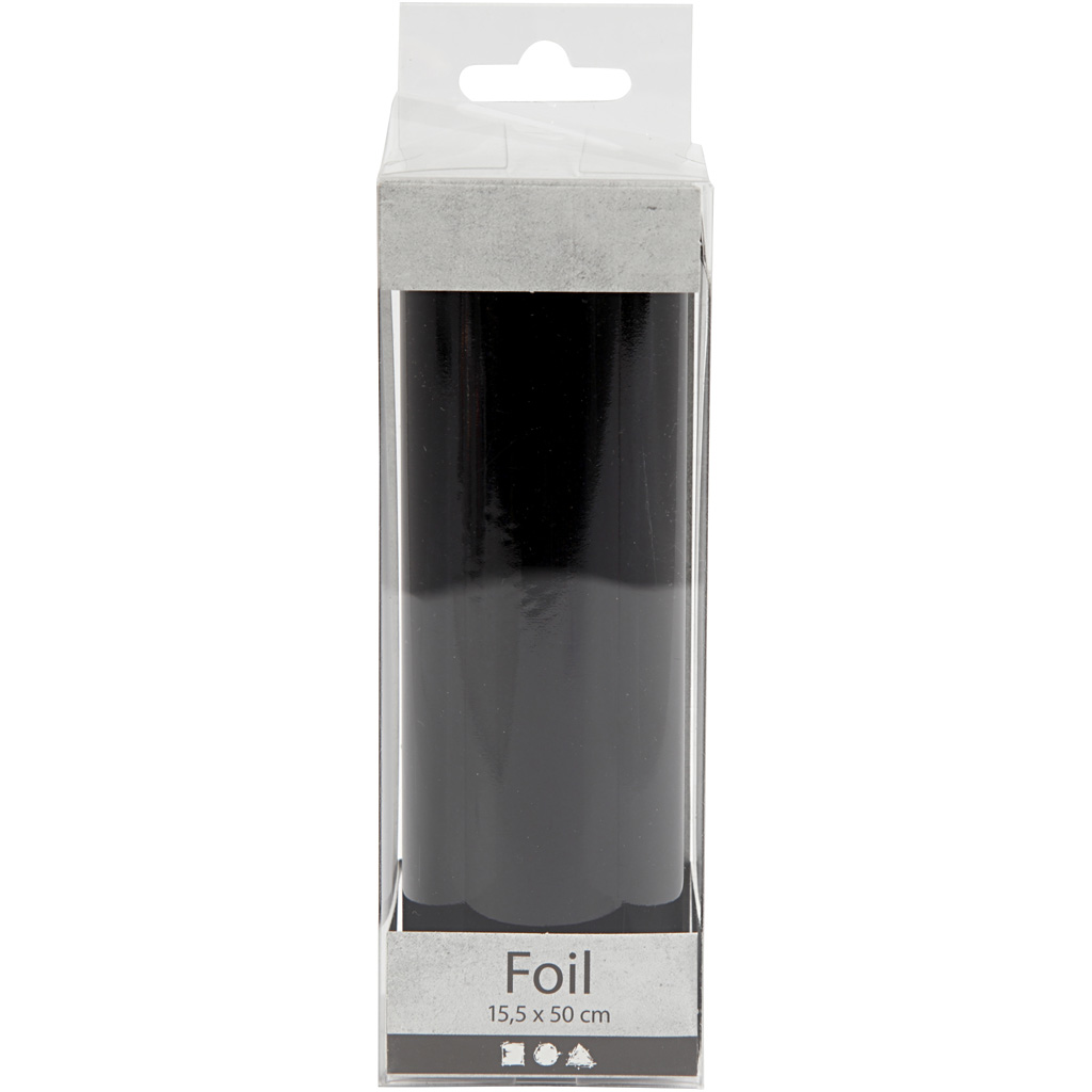 Decorative foil with metallic surface. Transferable to cardboard, paper, wood, etc. with adhesive tape, powertape, fix glue. Deco Foil, black, W: 15,5 cm, thickness 0,02 mm, 50 cm/ 1 roll