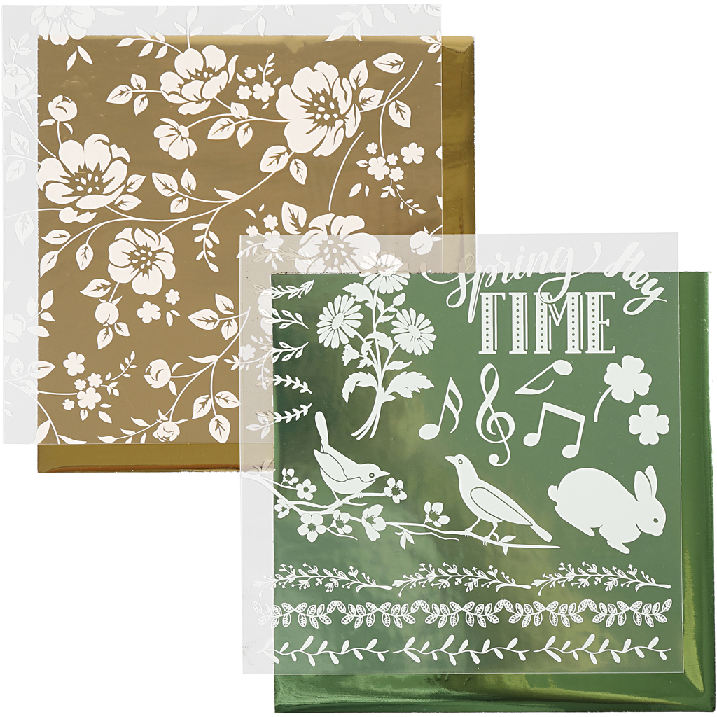 Set of decorative foil with metallic surface and design foil. Rub the motifs of glue on cardboard, paper, wood, etc. and then transfer the deco foil. Guidance included. Pack with 2 different colours deco foil and 2 transfer sheets. Deco Foil and transfer sheet, gold, green, flowers, 15x15 cm, 2x2 sheet/ 1 pack