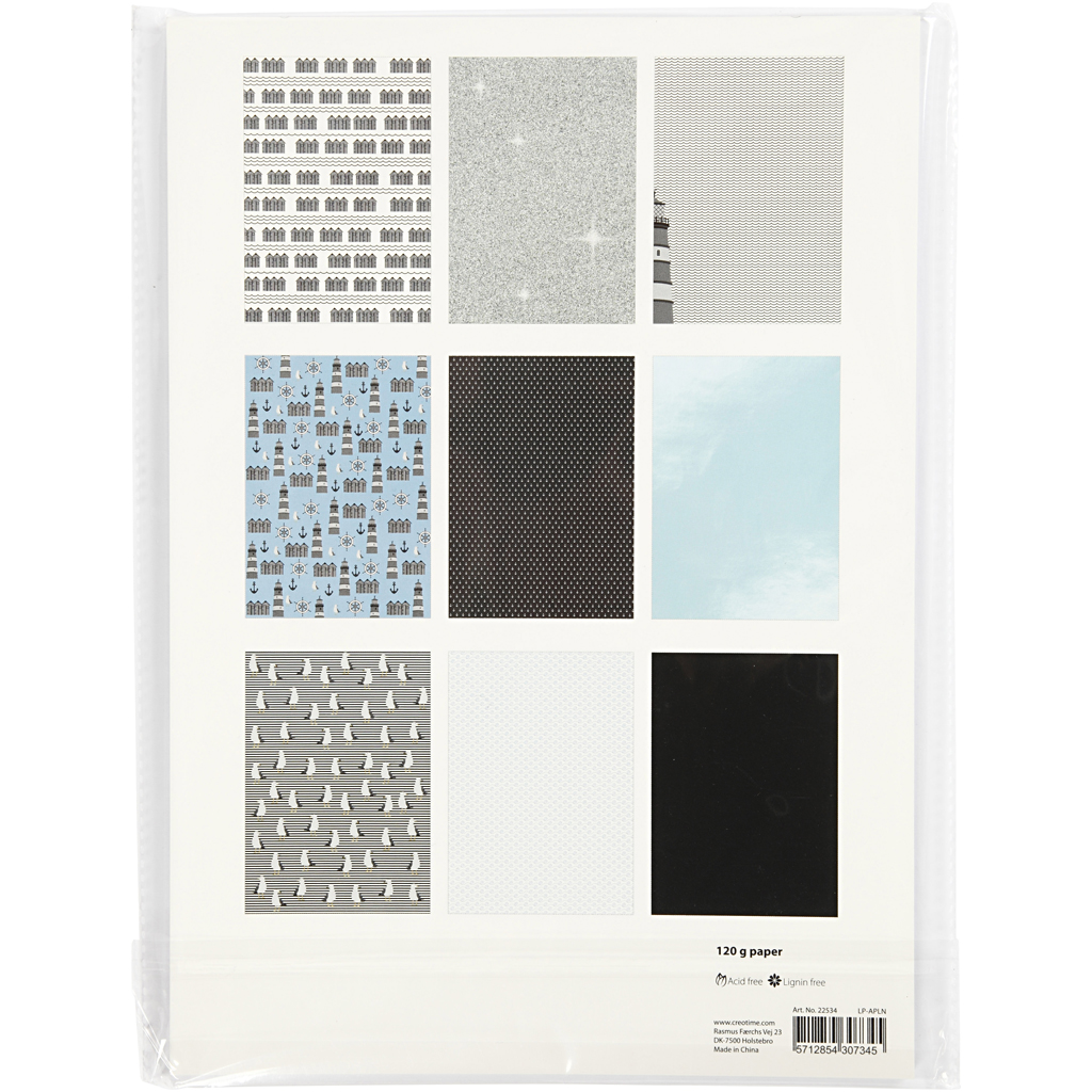 Patterned paper in block in matching shades from Vivi Gade. Contents: 6 design with 1-sided printing on 3 sheets (120 g / m2), 2 sheets of lacquer printed on both sides (128 g / m2) and 2 sheets of glitter print on both sides (128 g / m2) - total 24 sheet. Design Paper pad, black, blue, grey, white, size 21x30 cm, 120+128 g, 24 sheet/ 1 pack