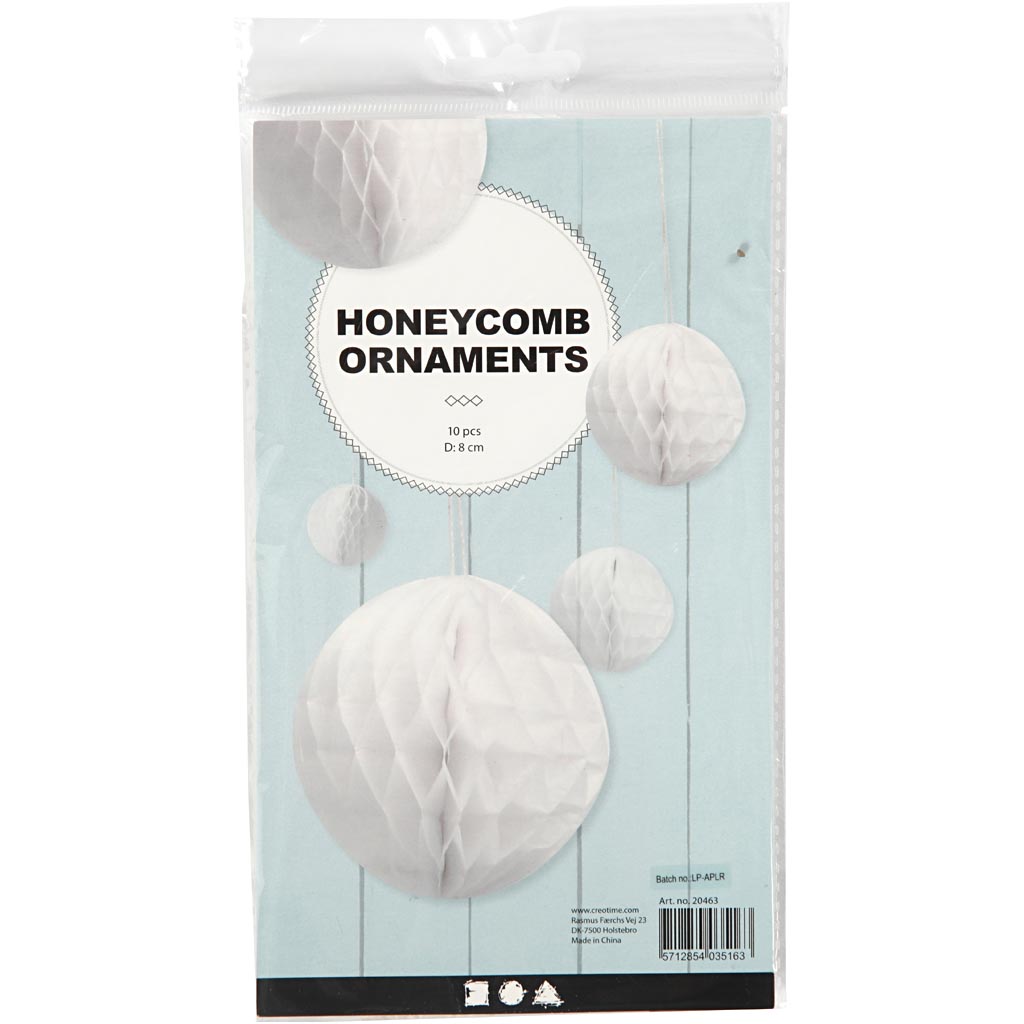 Paper ball of honeycomb paper with a string. Supplied unassembled. Honeycomb Ornaments, white, dia. 8 cm, 10 pc/ 1 pack