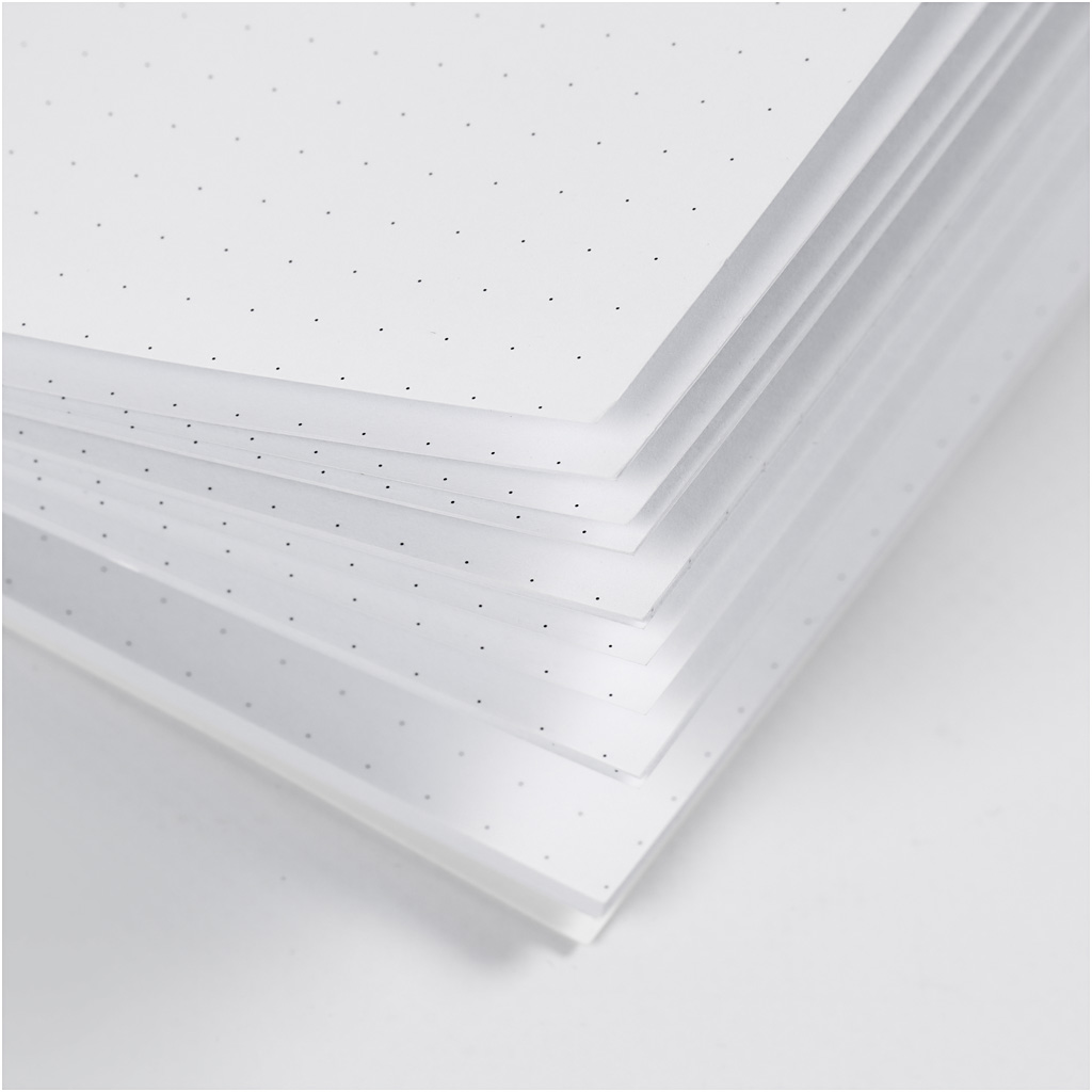 Notebook with white cover in heavy cardboard and double-printed pages. Perfect for bullet recordings, travelling- and creative journal. Fits calendar cover with elastic closure 192663 , 192664, 192668 and 192669. Notebook, white, dots, size 9,5x16,6 cm, 32 , 100 g, 1 pc