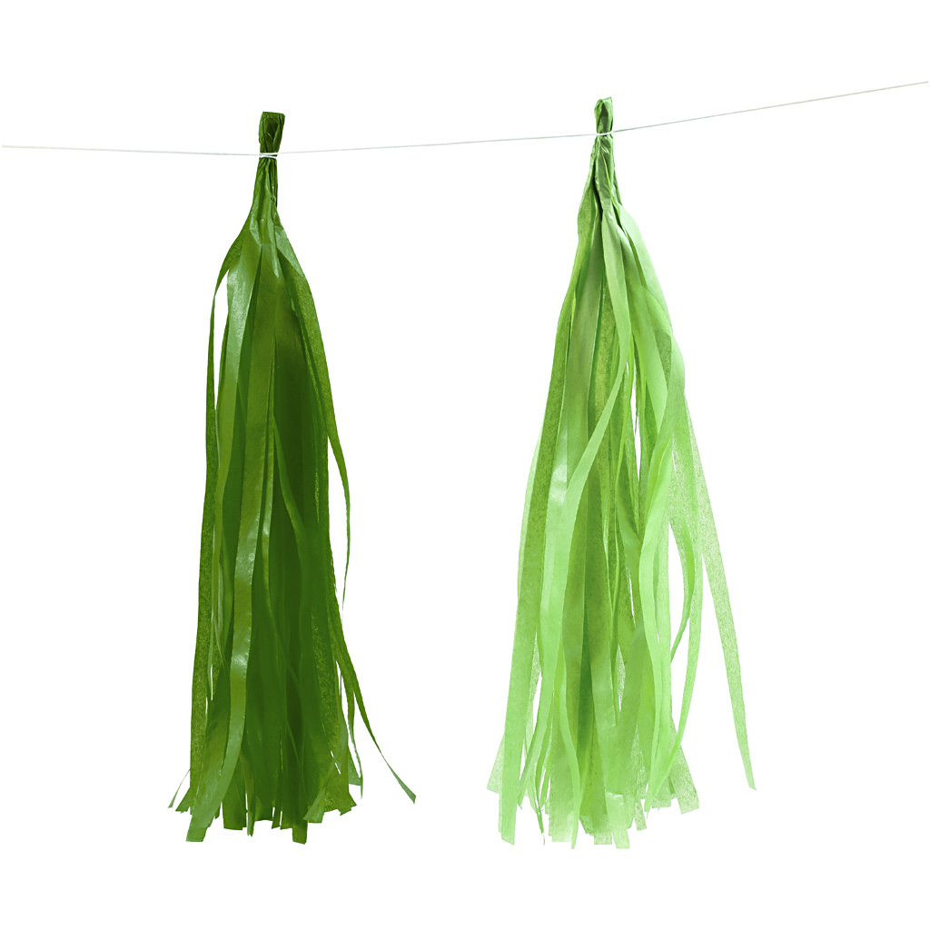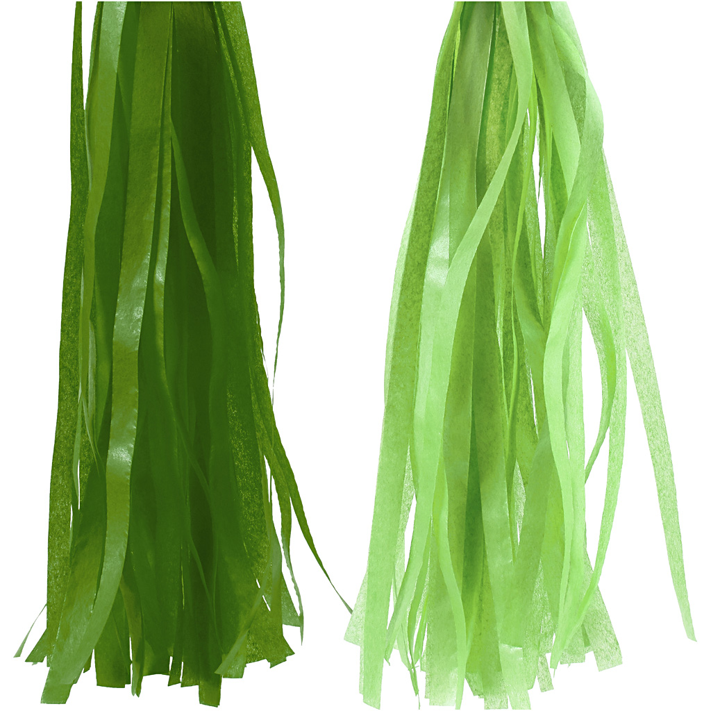 Silk paper in sheets with 12 long, narrow strips on each side. Pull apart, rolled together, twisted and bent in the middle. This creates a large and airy broom for use on eg garland. For 12 tassels in 2 colours (6 of each). 2x6 sheets with 12 fringes each. Paper Tassel, dark green/lime green, size 12x35 cm, 14 g, 12 pc/ 1 pack