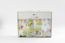 Sturdy cardboard figure to assemble, decorate with fringed tissue paper in different colours and fill up with candy or gifts. The Piñata is used for party games where you take turns, blindfolded, to beat it until the contents fall out. Comes with in. Comes with instructions to assemble, fringed silk paper (25g) in 6 colours, 10m tape, 10m tape, 40 cm string for suspension, glue and stickers with snout and eyes. Party Piñata, pastel colours, size 39x13x55 cm, 1 pc