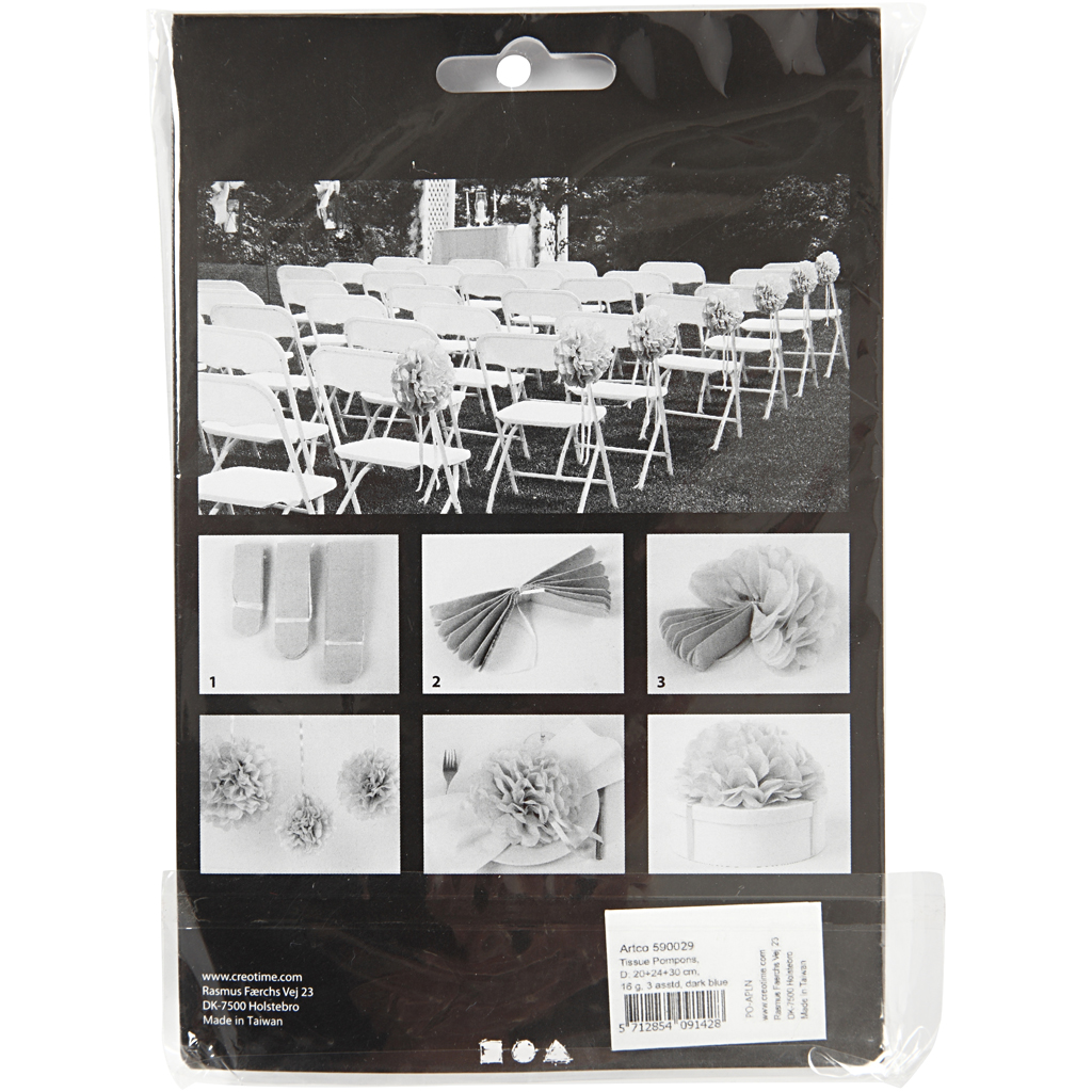 Airy pompoms made of silk paper. They fold out into round balls and are tied with string. Pack includes 3 different sizes. Supplied unassembled. Tissue Pompons, gold, dia. 20+24+30 cm, 16 g, 3 pc/ 1 pack