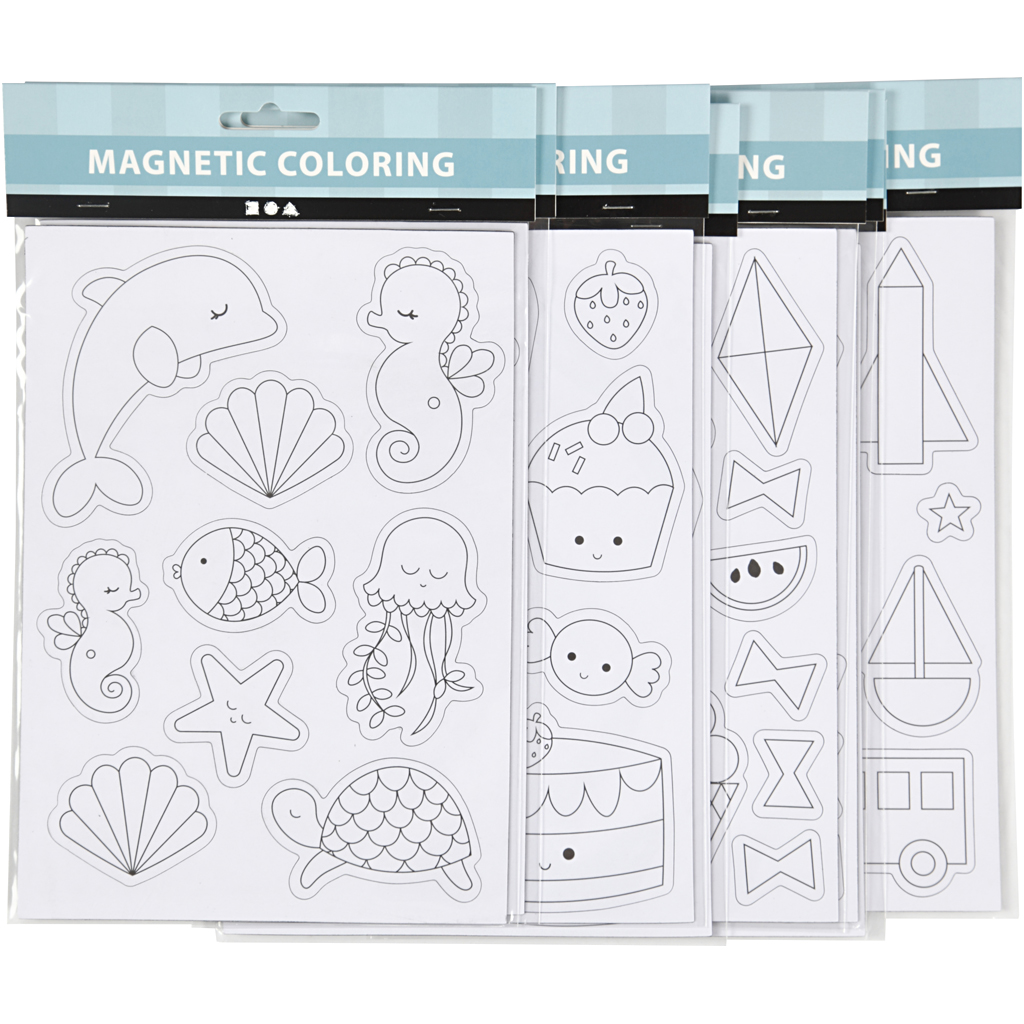 Assortment of punched magnet figures with preprinted motifs. Lightly decorated with black, coloured pencils, glitter, etc. Pack with 4 different designs - 2 sheets of each. Magnets, 14,85x21 cm, 8 sheet/ 1 pack