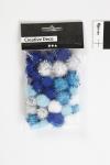 Spherical pompoms in different colours and two sizes, with and without glitter. Pompoms, light blue, dark blue, white, dia. 15+20 mm, 48 asstd./ 1 pack