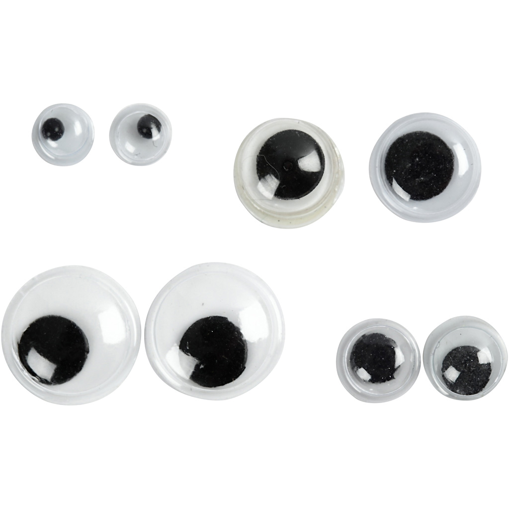 Wiggly eyes with moving pupils that you can use on anything that needs a fun look. The eyes have a flat, non-sticky backing. Pack with 4 different sizes each of 10 pcs. Wiggly Eyes, not sticky, dia. 4+6+8+10 mm, 40 asstd./ 1 pack