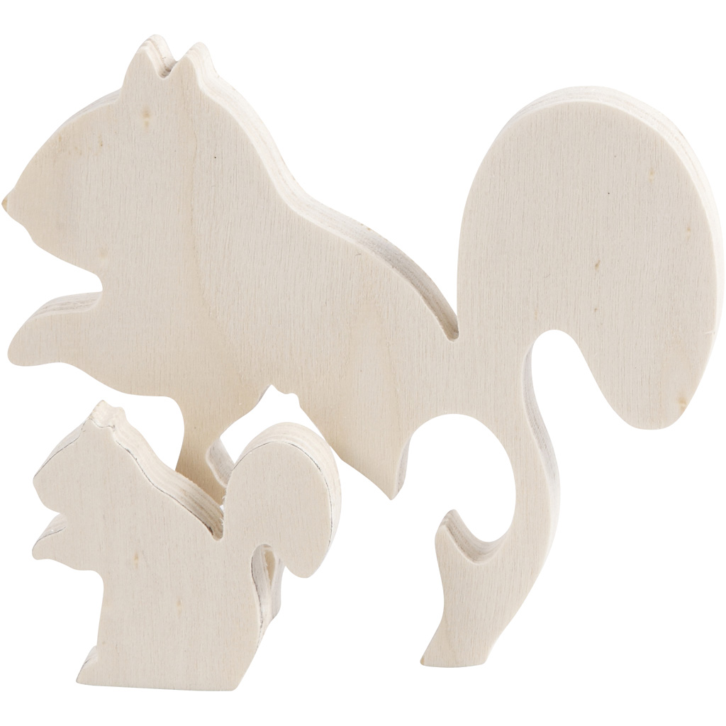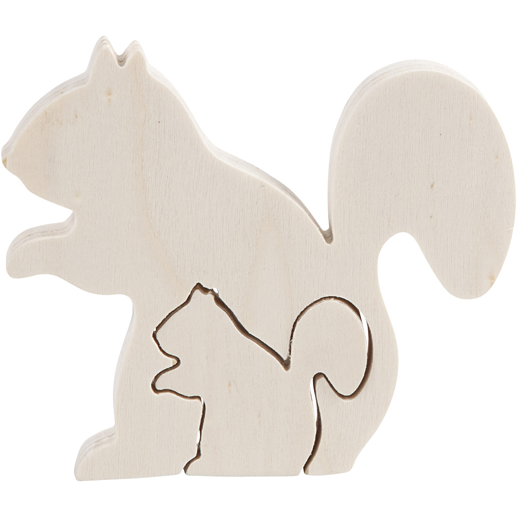Two figures in one, made of light wood. The smallest removable piece can be removed from the largest. 2in1 Figure, squirrels, H: 3,5+8,5 cm, depth 1,2 cm, W: 4,2+10 cm, 1 set