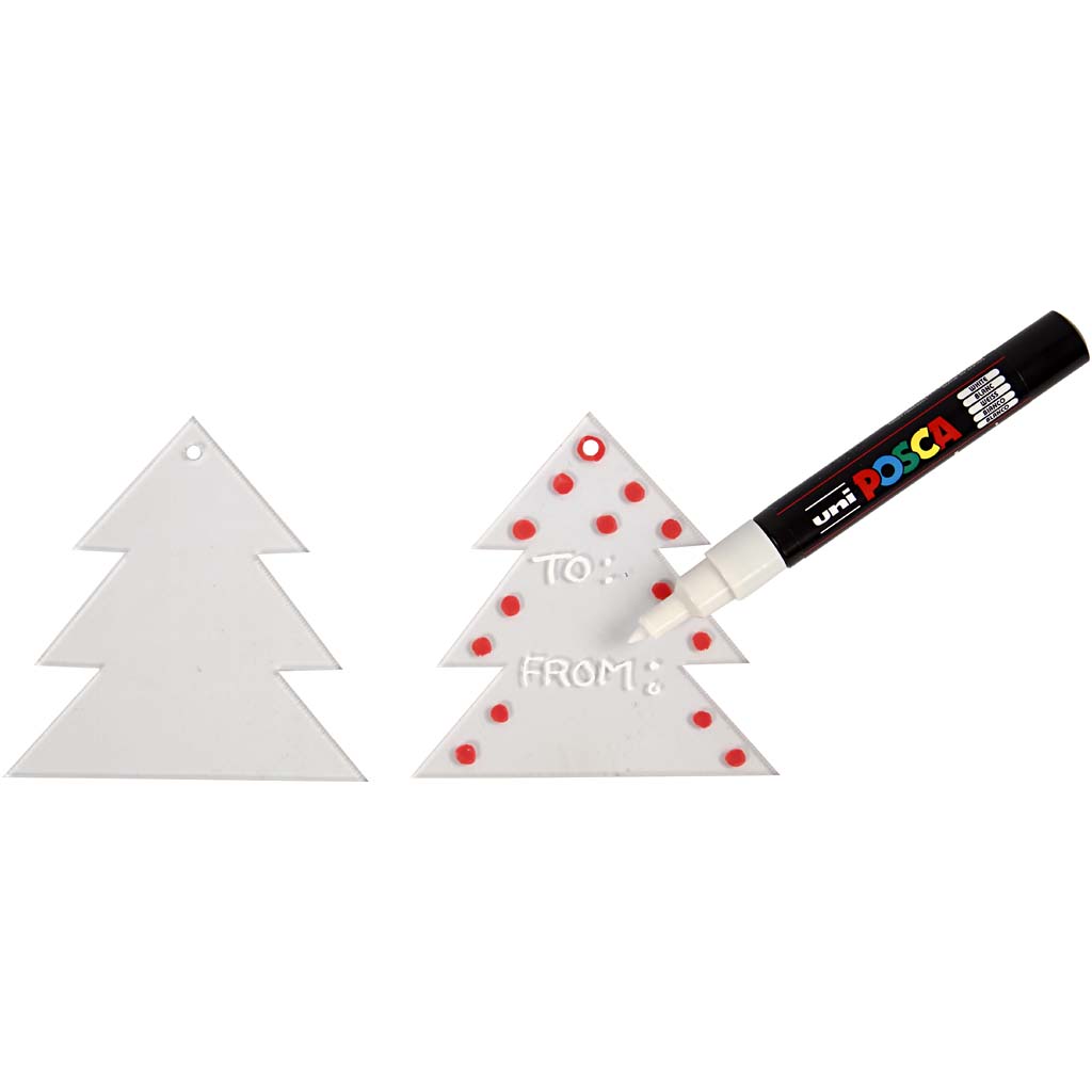 Single ornament of clear acryligc with a hole in the top Display box with 4 different designs: star, heart, snow crystal and christmas tree. Acrylic ornaments, christmas tree, H: 8 cm, thickness 2 mm, 5 pc/ 1 pack