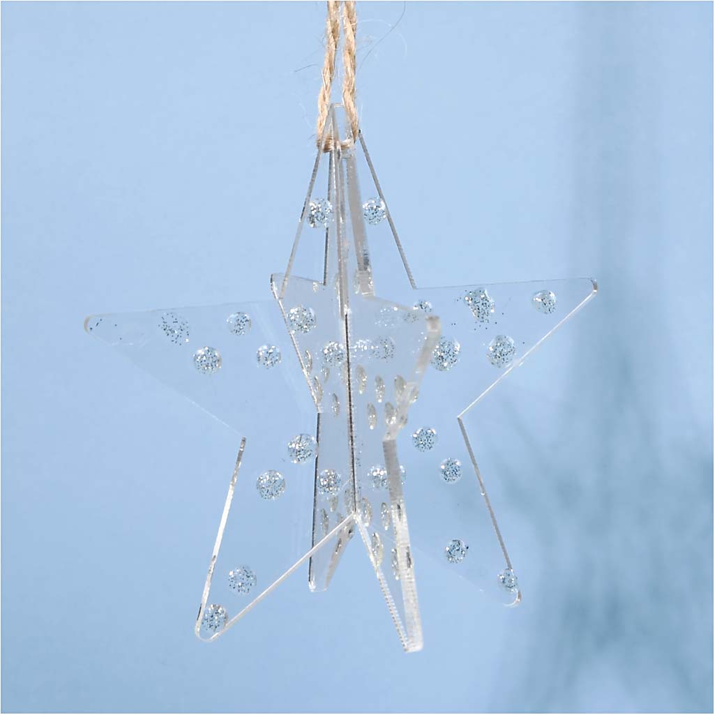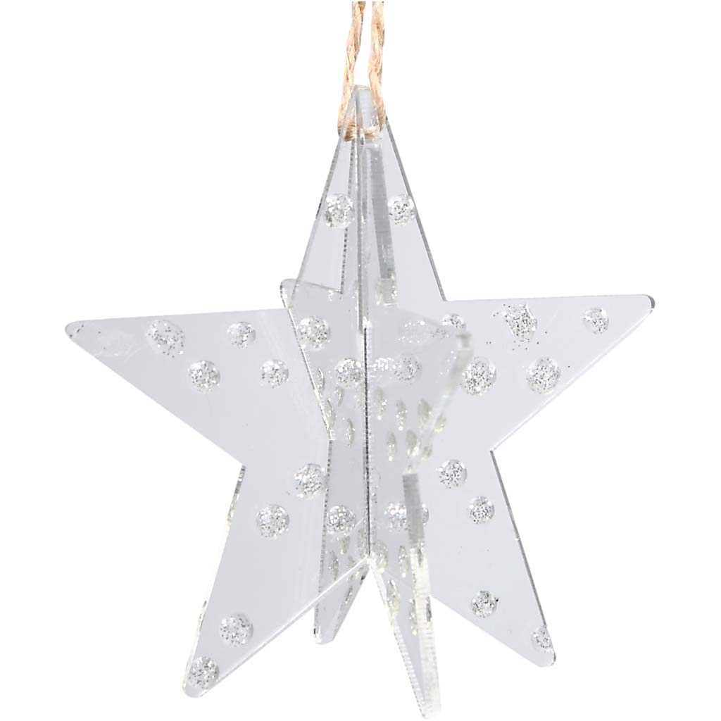Two-piece ornament in clear acrylic with a jute string for mounting. Acrylic ornaments, 3D star, size 7,5x7,5 cm, thickness 2 mm, 3 pc/ 1 pack