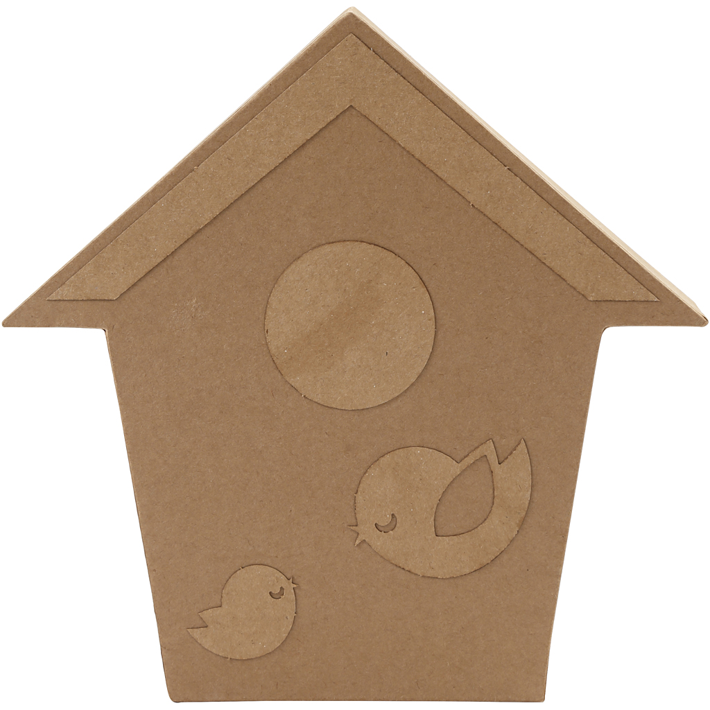 Figure of papier-mâché with flat front and back and can be free standing. On the one side mounted with details of card. Bird House, H: 18 cm, depth 2,5 cm, 1 pc